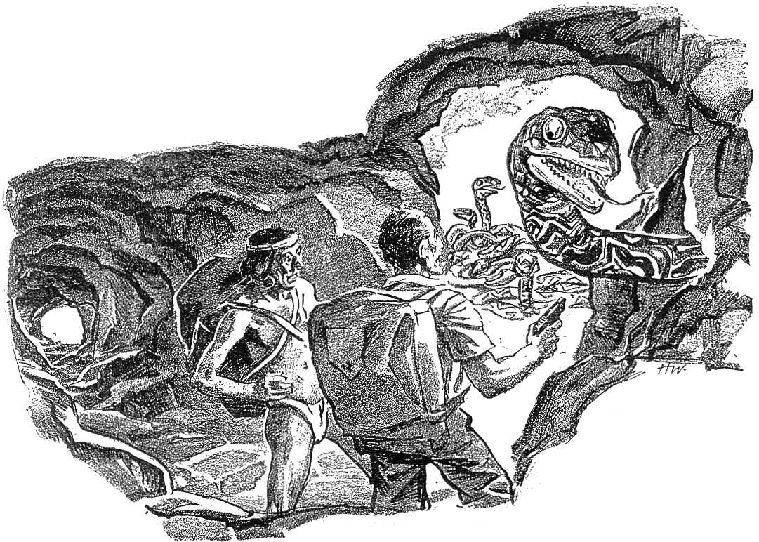 Then for the first time, I realized that I was unconsciously assuming that I actually had looked into the future, or at least had, by some mysterious means, been enabled to view the route we were following. Nonsense! I said to myself. How could I have seen a place I had never visited? By some form of hypnosis or auto-suggestion Nohul Voh might have caused me to think I saw the valley near the cliff with the great idol. I had seen that before. But I had surely never been here by this broad stream. Yet there was the symbol on the rock by the pool. There was the stream. Try as I might to argue against it, I felt in my heart and innermost mind that everything would eventuate precisely as I had seemed to see it back in Mictolan. And at any rate, it would be far easier and quicker to travel down river by boat or raft than to follow the winding course of the stream afoot.