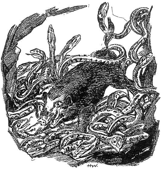 We had now passed through the village, had skirted the base of the temple-mound and had approached a low, ancient stone building with a sculptured frieze of jaguar heads and entwined serpents.