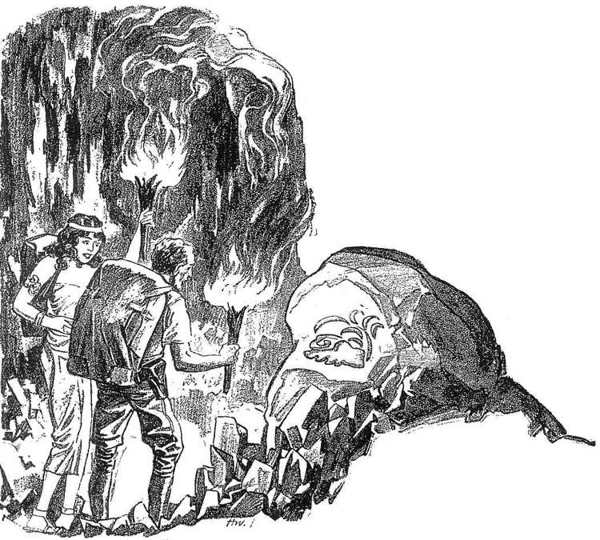 I halted, tried to collect my thoughts, to reason calmly, to concentrate upon the matter. The opening through which we had come was still visible, the morning sun streaming into it. As nearly as I could calculate, it faced southeast. I revisualized the surroundings of the tilting idol at the other entrance, and felt sure it faced the north. I have a rather remarkable sense of direction and I felt certain that I was not mistaken in this. In that case, one entrance would be almost directly opposite the other. Of course it might be far to one side or the other, far to the east or west, but if we followed a straight course towards the north, we must eventually reach the limits of the cavern, and even if we did not see the light that indicated the opening, we could move east or west until we located it. And it would not be difficult to follow a straight line. By noting some peculiarity of a stone column ahead of us, and sighting back to the still visible entrance, we could move forward. Then we could select another column ahead, smudge the one beside which we stood with smoke, and move to the next. There were so many columns that it would be easy to align our course even after we lost sight of the entrance behind us.