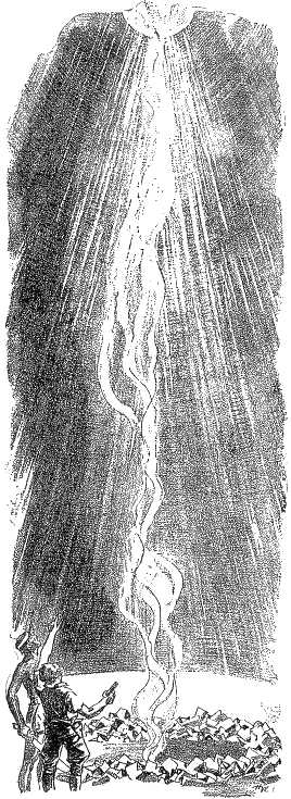 I was puzzled. Had we lost our way, had we become confused and was the symbol right, or did the symbol point the way to another entrance? Should we follow it—perhaps to find that in the ages that had passed since it had been cut, the entrance it led to had been blocked by débris? Or should we ignore it and continue on our course? Then I remembered that, in the vision I had seen, the same symbol was cut there in the valley near the giant tilting idol. That then must be the only exit; the symbol must lead to it. But how, where could we find the next mark? If we left the spot, if we wandered about hunting here, there and everywhere for the next symbol and failed to locate it, could we ever find our way back to the place where we stood, and could we again proceed in the straight line we were following? My torch illuminated only a small area of the cavern, we would have to search very carefully, very slowly for the mark, and there was the chance—the certainty almost—that many, if not most of the symbols, had been covered with the stalactitic material during the countless centuries. Suddenly memory of Nohul Voh’s enigmatical words flashed across my mind, the words he had uttered when he had given me the bamboo tube that had served me so well and so mysteriously in the temple: “It may serve you well within that Cavern of the Bats.” Strange that I should have forgotten it. What had the old sorcerer meant? Had he merely uttered generalities, meaning it might answer as a torch to light our way, or was there a deeper, hidden meaning?
