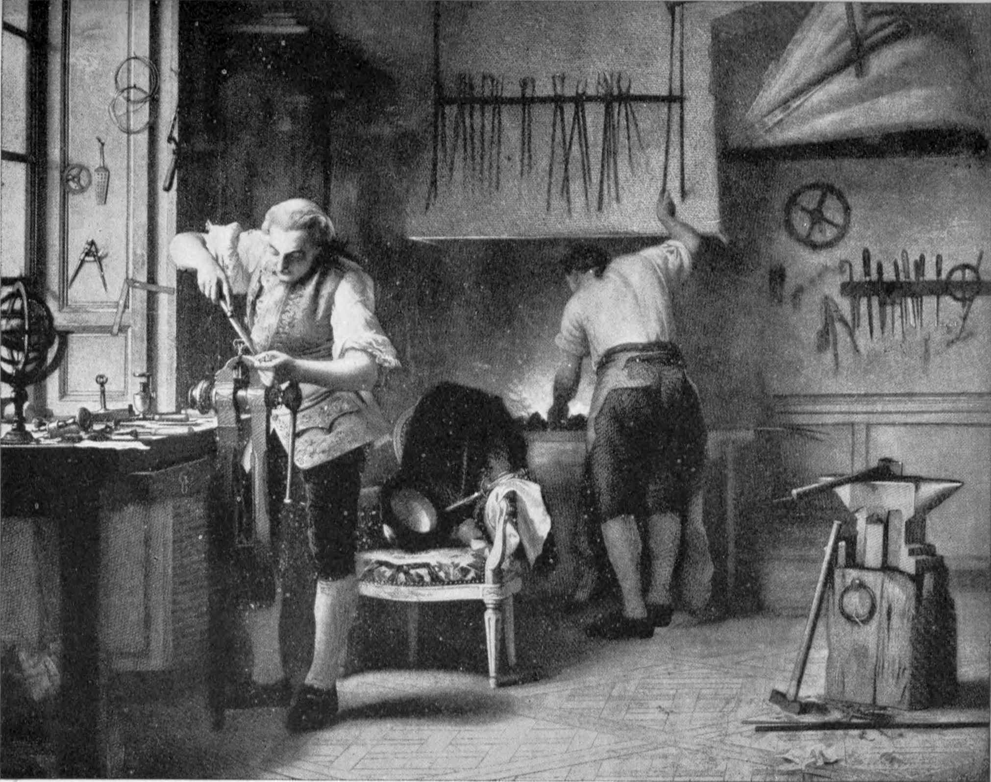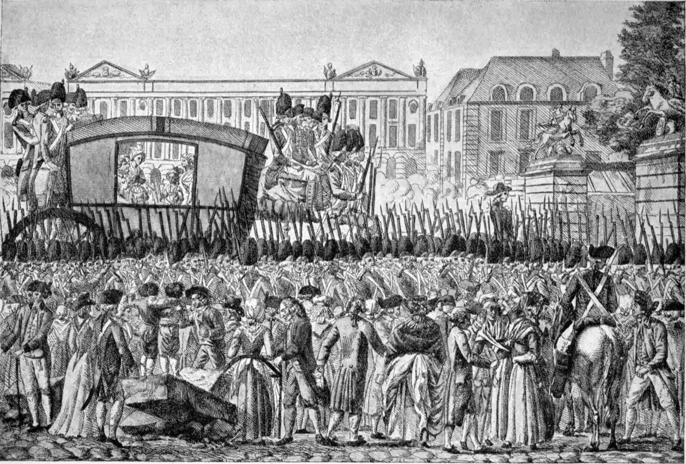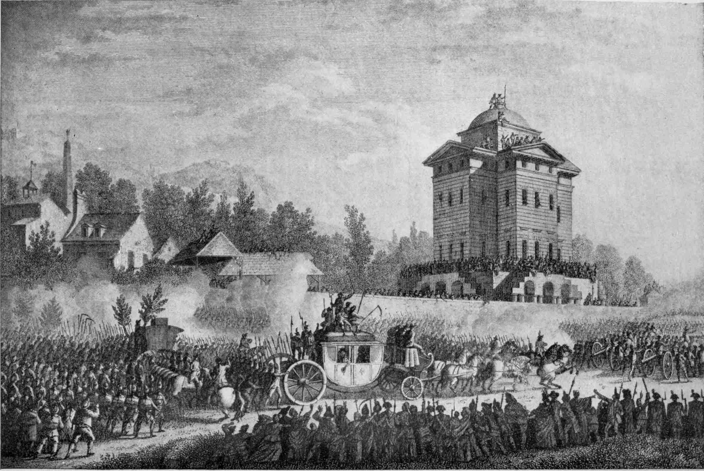 Outside this the guards were drawn up, and a roomy carriage of the sort that was then hired in the streets by the wealthy stood at the entrance. Two policemen armed with muskets were awaiting him at the carriage door. As Louis appeared, one of these men got in and took his seat with his back to the horses. Then the king entered, sitting in his{213} proper place upon the right, facing him, and motioned to the priest, Edgeworth, to sit beside him. When they were both thus seated, the second policeman took his place opposite, and he and his colleague set their guns before them. The door was shut, the cab started at a foot’s pace.