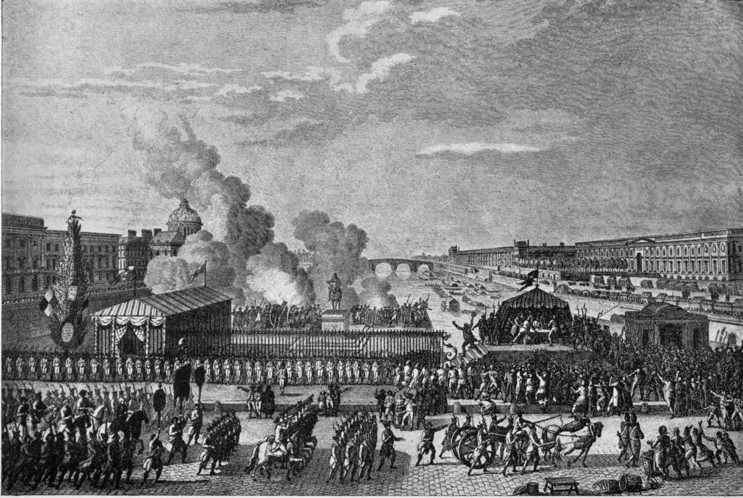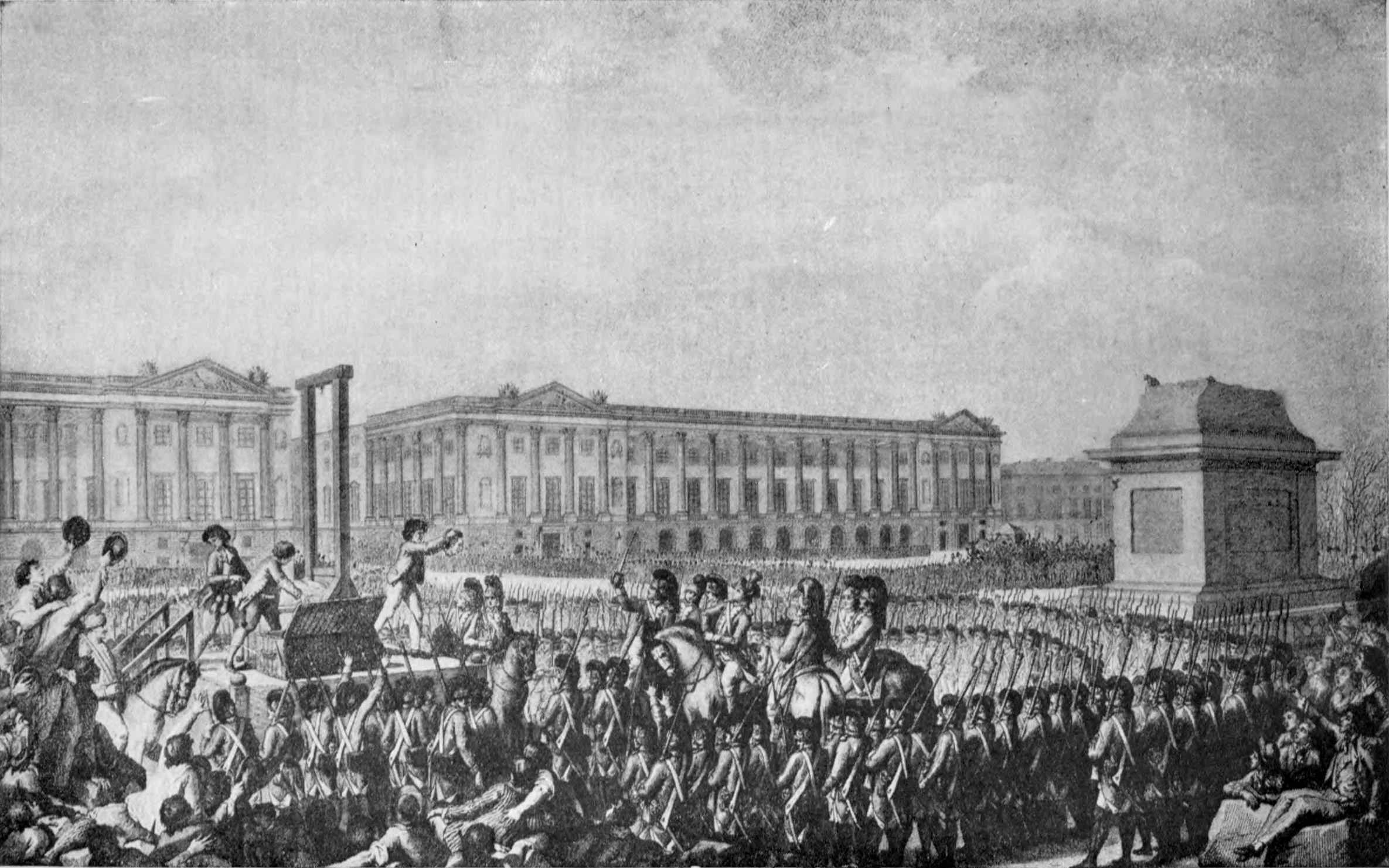 They had come to that wide open space which is now called the Place de la Concorde, and as he looked quietly through the windows, the doomed man perceived a great throng of people densely packed about a sort of square of cannon which surrounded the scaffold and guillotine. That fatal woodwork and the machine it bore stood near the entrance of the Rue Royale and a little to the east. One of the executioners (who stood at the foot of the scaffold) took the handle of the carriage door to open it. Louis stopped him and, putting one hand on the priest’s knee before he got out, said: