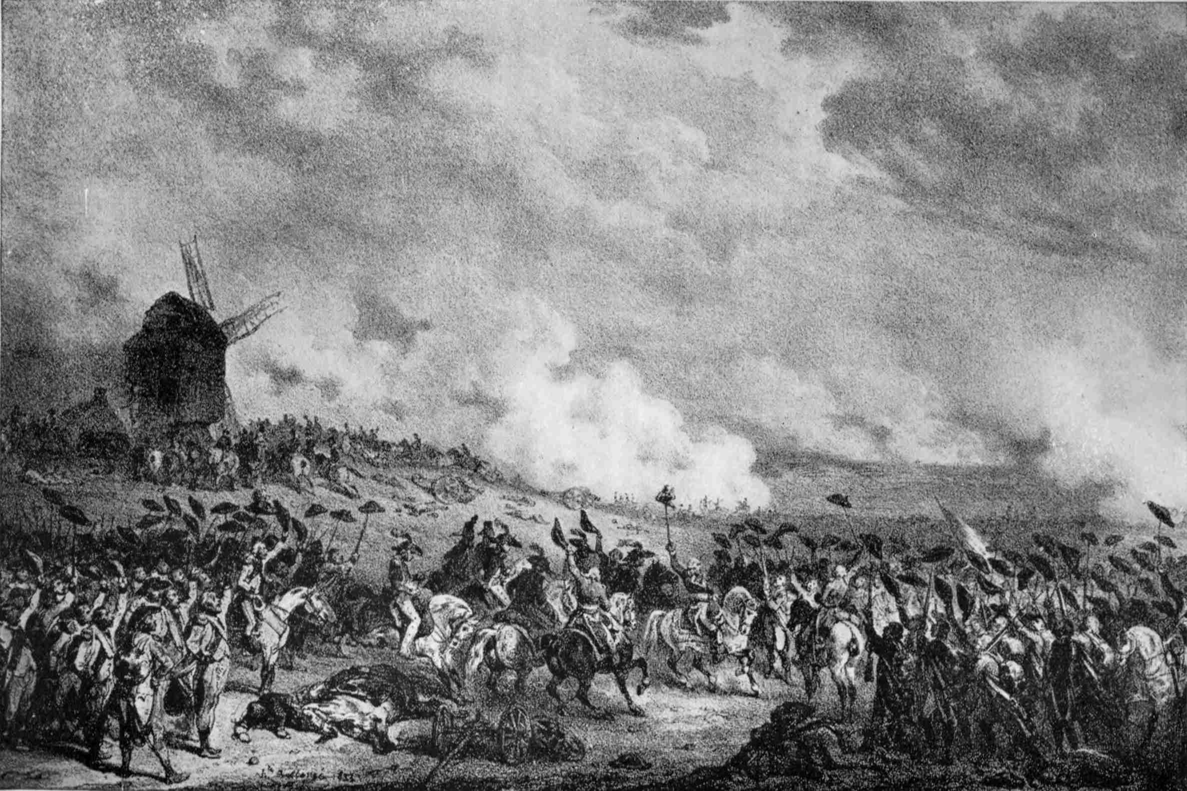 But the range was long for the field-pieces of those days, and one’s target at a thousand yards very uncertain. Many a missle flew over the heads of the motley French line, many fell short, and buried themselves in the wet bank of the slope{185} before it. The losses so inflicted by hour after hour of sustained battery-work were not great, nor did that loose line upon each side of the mill seem to fluctuate or waver, nor were the King of Prussia and his staff, or Brunswick, commanding all, over-certain when the apt time for the critical charge and the advance of their infantry would come.