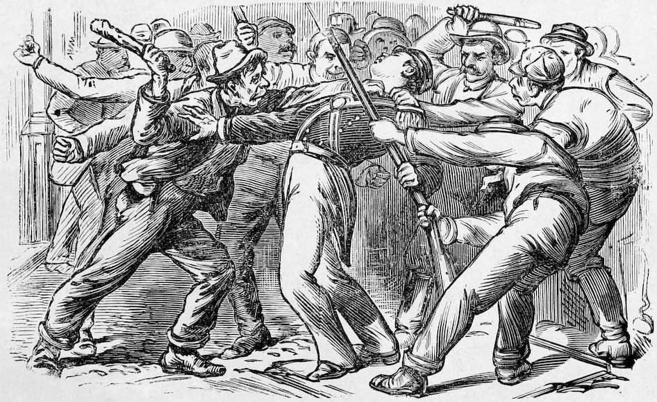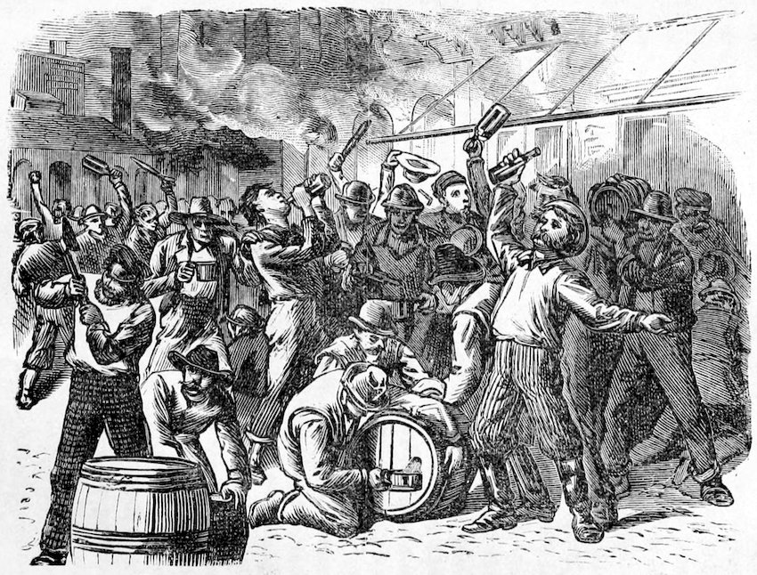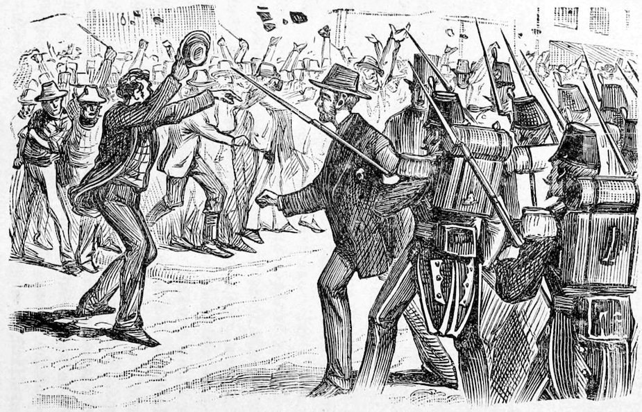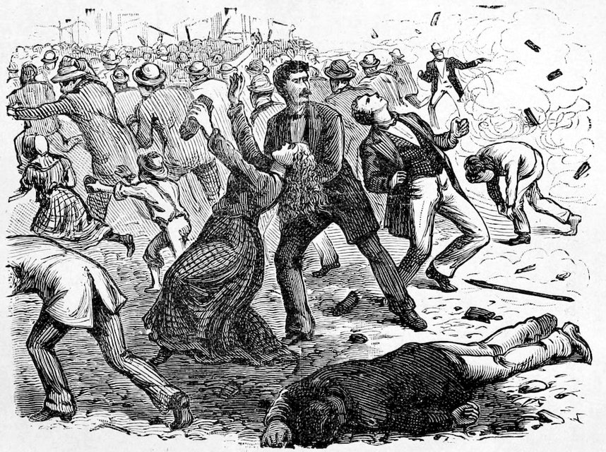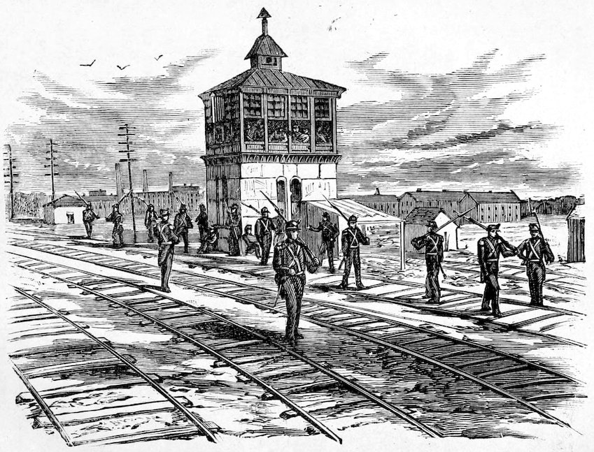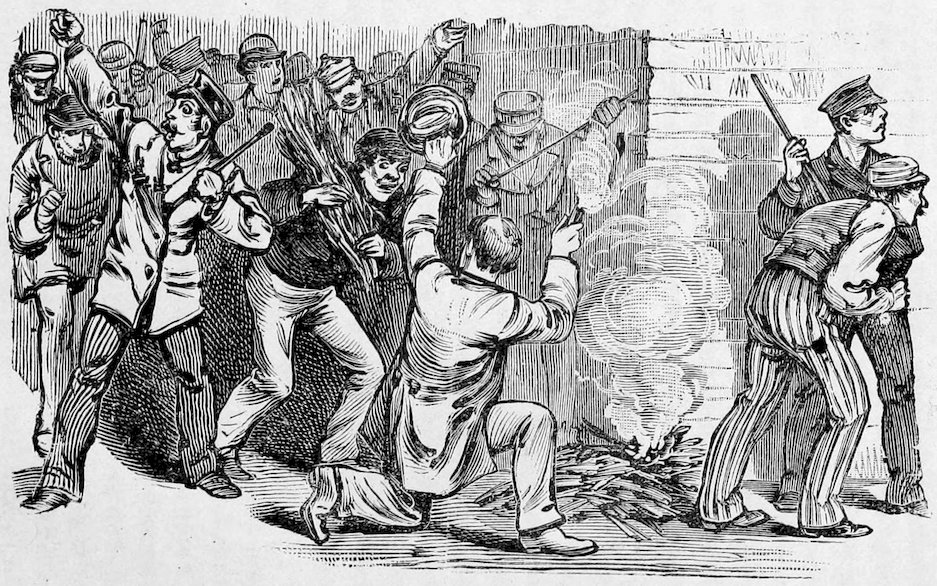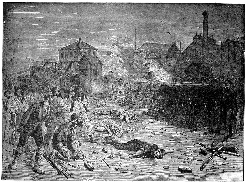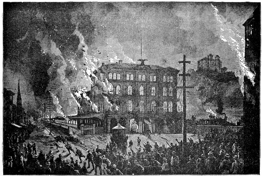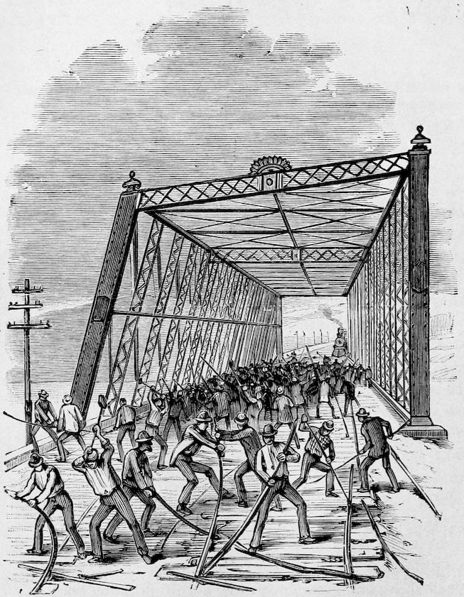 In this uprising of the laborers against their employers, aggravated as it was by the early appearance on the scene, of a vast number of theorists, and dangerous characters, who sought their opportunity, during the reign of general tumult to subvert the very fundamental principles of social order, we have gained a deeper knowledge of the character of the American people. Sudden as a thunder-burst from a clear sky, the crisis came upon the country. Hundreds and thousands of men belonging to the laboring classes, alleging that they were wronged and oppressed, ceased to work, seized railroads, closed factories, founderies, shops and mills, laid a complete embargo on all internal commerce, interrupted travel, and bid defiance to the ordinary instruments of legal authority. Commencing at Camden Station, Baltimore, and at Martinsburg, West Virginia, in three days the movement had extended to Pittsburgh, Newark, Ohio, Hornellsville, Fort Wayne and a hundred other points. State militia forces were encountered and repelled. The whole country seemed stricken by a profound dread of impending ruin. In the large cities the cause of the strikers was espoused by a nondescript class of the idle, the vicious, the visionary and the whole rabble of the Pariahs of society. No standing army was available, and these classes absolutely controlled the country.