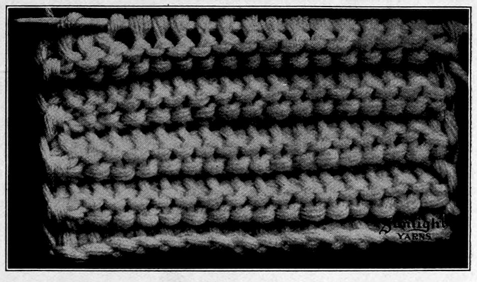 Knit 2, purl 2; work forward and back and make 3 rows. Work 2 rows in lavender and 2 more rows in white. Next row in lavender: * Knit the 2 plain stitches together as 1, put yarn over needle and purl the 2 purled stitches together as 1, yarn over needle and repeat from * to end of row.