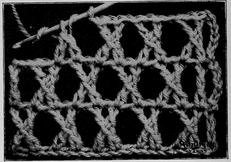 1st row: Work 1 double crochet in the 5th stitch from needle, make another double crochet across the 1st one in the next stitch on the chain. This makes the Cross Stitch.