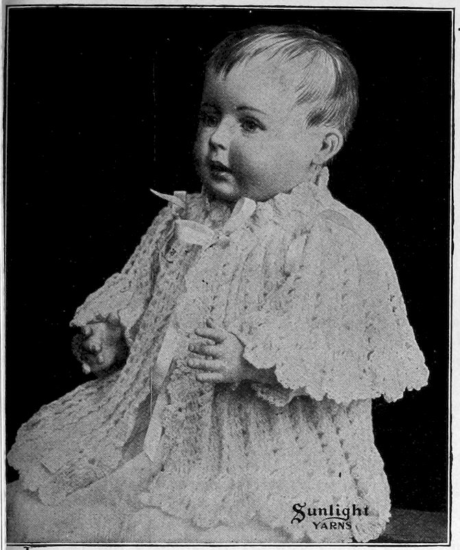 SUNLIGHT Lusterine is a very soft yarn with a lustrous strand running spirally about it. It is largely used for making up dainty infants’ garments, scarfs, shawls, etc.