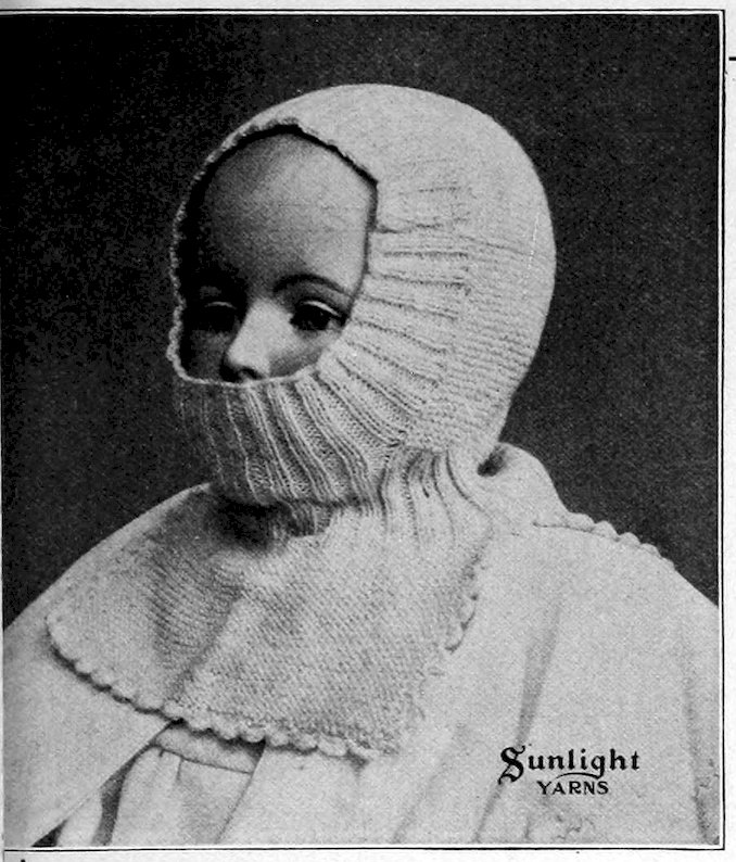 SUNLIGHT Angora works up very beautifully into infants’ soft hoods, Tam o’Shanters, infants’ muffs and women’s mitts, caps and toques. It gives a soft, fluffy surface.