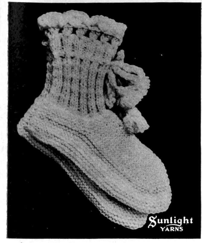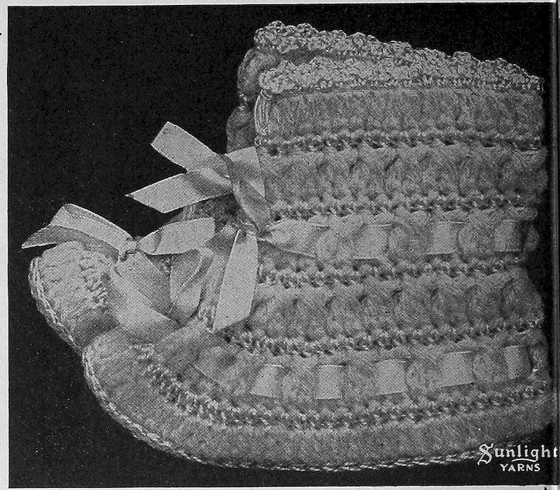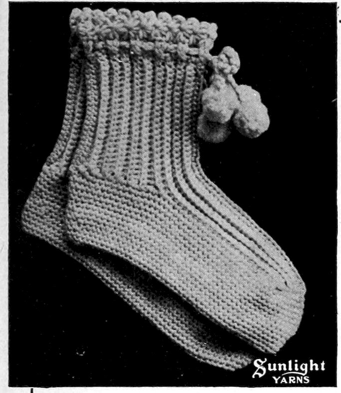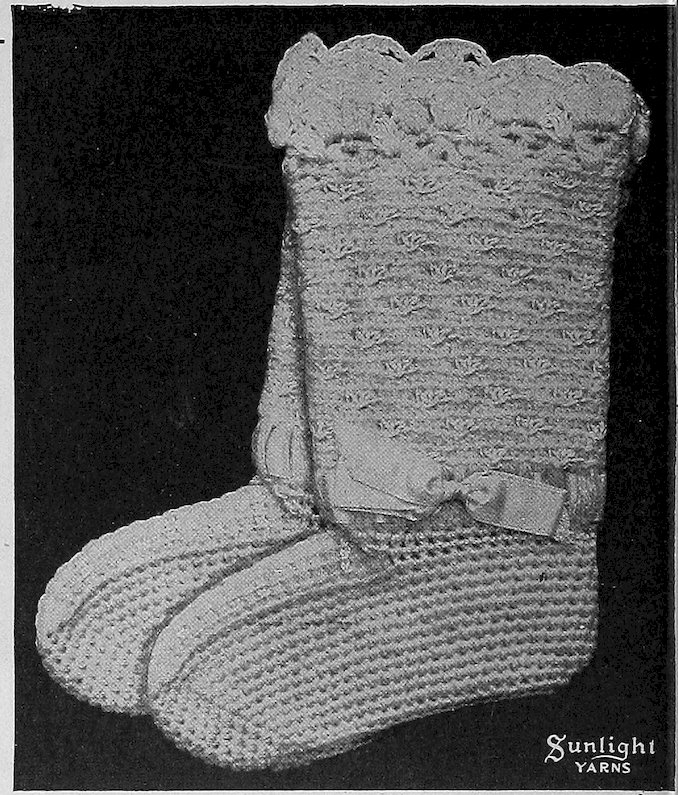 These serviceable bed socks are crocheted with the ribs alternating in pink and white. A pretty border is worked at top and a cord with little pompons on is pulled through to tie with.
