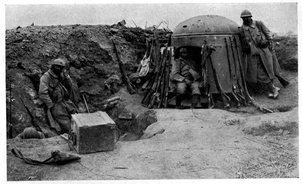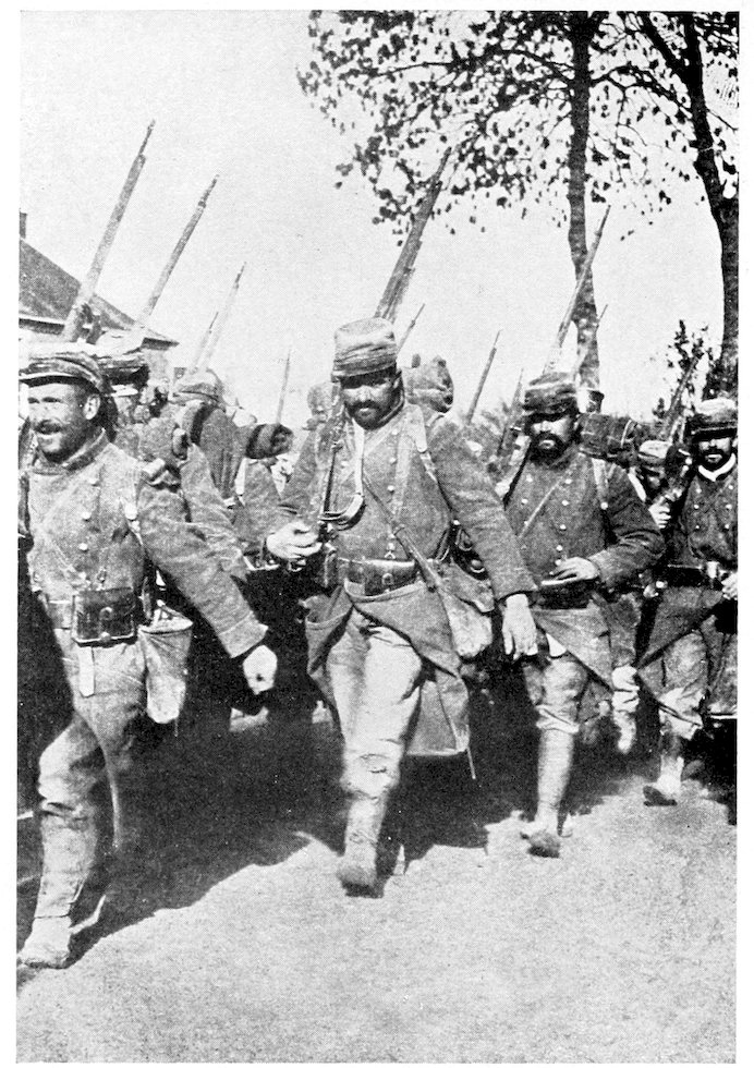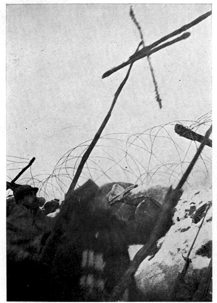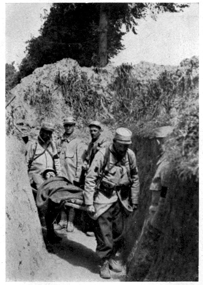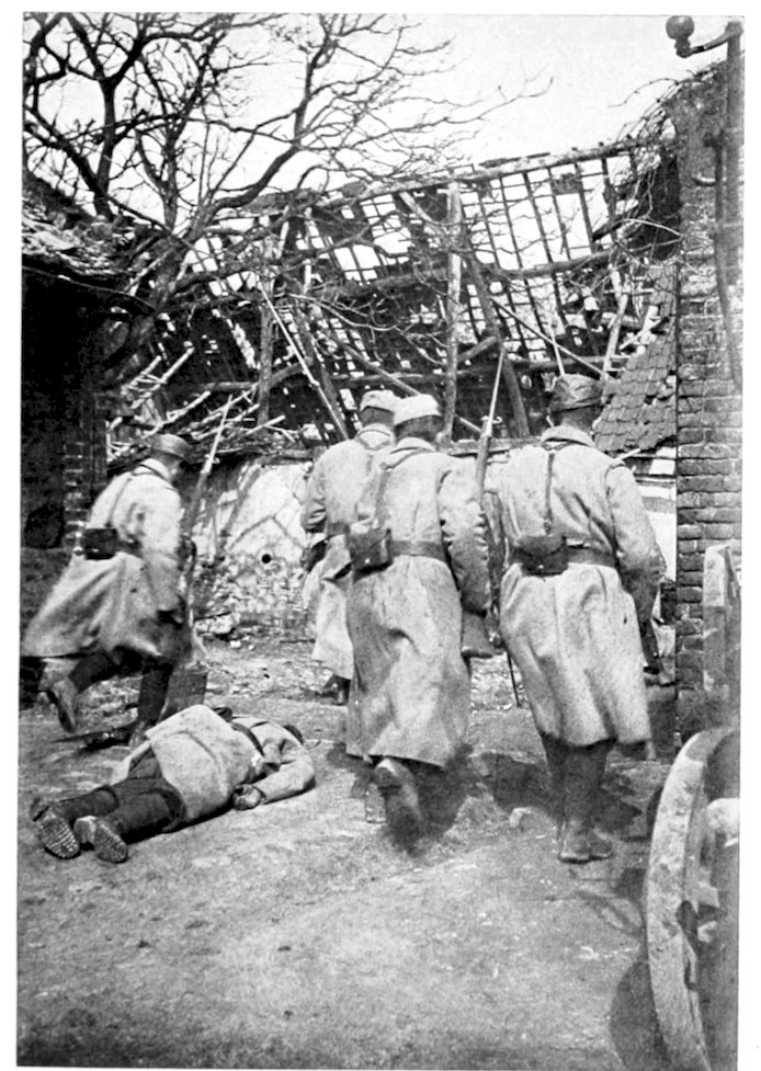 167Great as was the destruction wrought by 168the bombardment, the French infantry had 169no easy task before them, for stretches of wire entanglements still remained in front of portions of the German trenches, while at frequent intervals the Germans had left behind them machine-gun sections, who from their sunken positions poured in a deadly fire, until the oncoming wave overwhelmed and blotted them out. It was these death-traps that brought out in the French soldier those same heroic qualities which had enabled him, under 170the leadership of Napoleon, to enter as a conqueror every capital in Europe. A man who was shot while cutting a way for his company through the wire entanglements, turned and gave the cutters to a comrade before he fell. A wounded soldier lying on the ground called out to an officer who was stepping aside to avoid him: “Go on. Don’t mind stepping on me. I’m wounded. It’s only you who are whole who matter now.” A man with his abdomen ripped open by a shell appealed to an officer to be moved to a dressing-station. “The first thing to move are the guns to advanced positions, my friend,” was the answer. “That’s right,” said the man; “I can wait.” Said a wounded soldier afterward in describing the onslaught: “When the bugles sounded the charge and the trumpets played the Marseillaise, we were no longer mere men marching to the assault. We were a living torrent which drives all before it. The colors were flying at our side. It was splendid. Ay, my friend, when one has seen that one is proud to be alive.”
