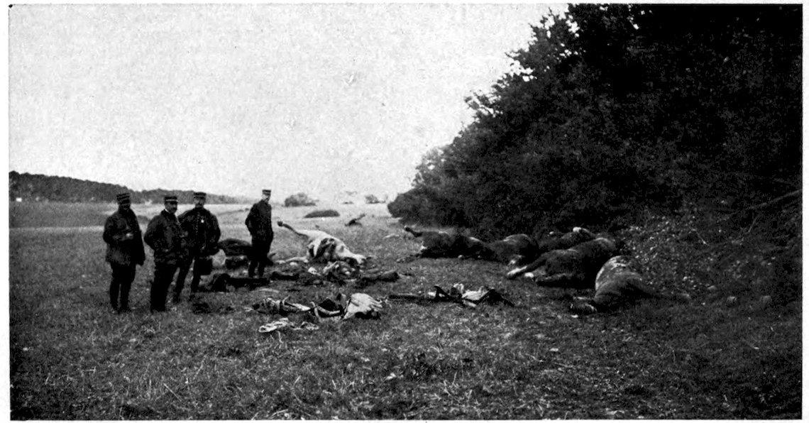 Choosing the psychological moment, when the retirement of the Germans showed signs of turning into panic, the African troops were ordered to go in and finish up the business with cold steel. Before these dark-skinned, fierce-faced men from the desert, who came on brandishing their weapons and shouting “Allah! Allah! Allah!” the Germans, already demoralized, incontinently broke and ran. Hard on the heels of the Africans trotted the dragoons and the chasseurs à cheval—the first time since the trench warfare began that cavalry have had a chance to fight from the saddle—sabring the fleeing Germans or driving them out of their dug-outs with their long lances. But in the vast maze of communication trenches and in the underground shelters Germans still swarmed thickly, so the “trench cleaners,” as the Algerian and Senegalese tirailleurs are called, were ordered to clear them out, a task which they performed with neatness and despatch, revolver in one hand and cutlass in the other. Even five days after the trenches were taken occasional Germans were found in hiding in the labyrinth of underground shelters.