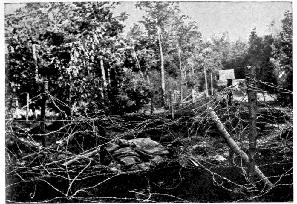 The French officers who accompanied me over the battle-field particularly called my attention to a steel turret, some six feet high and eight or nine feet in diameter, which had been mounted on one of the German trench walls. The turret, which had a revolving top, contained a 50-millimetre gun served by three men. The French troops who stormed the German position found that the small steel door giving access to the interior of the turret was fastened on the outside by a chain and padlock. When they broke it open they found, so they told me, the bodies of three Germans who had apparently been locked in by their officers, and left there to fight and die with no chance of escape. I have no reason in the world to doubt the good faith of the officers who showed me the turret and told me the story, and yet—well, it is one of those things which seems too improbable to be true. When I was in Alsace the French officers told me of having found in certain of the captured positions German soldiers chained to their machine-guns. There again the inherent improbability of the incident leads one to question its truth. From what I have seen of the German soldier, I should say that he was the last man in the world who had to be chained to his gun in order to make him fight. Yet in this war so many wildly improbable, wholly incredible things have actually occurred that one is not justified in denying the truth of an assertion merely because it sounds unlikely.