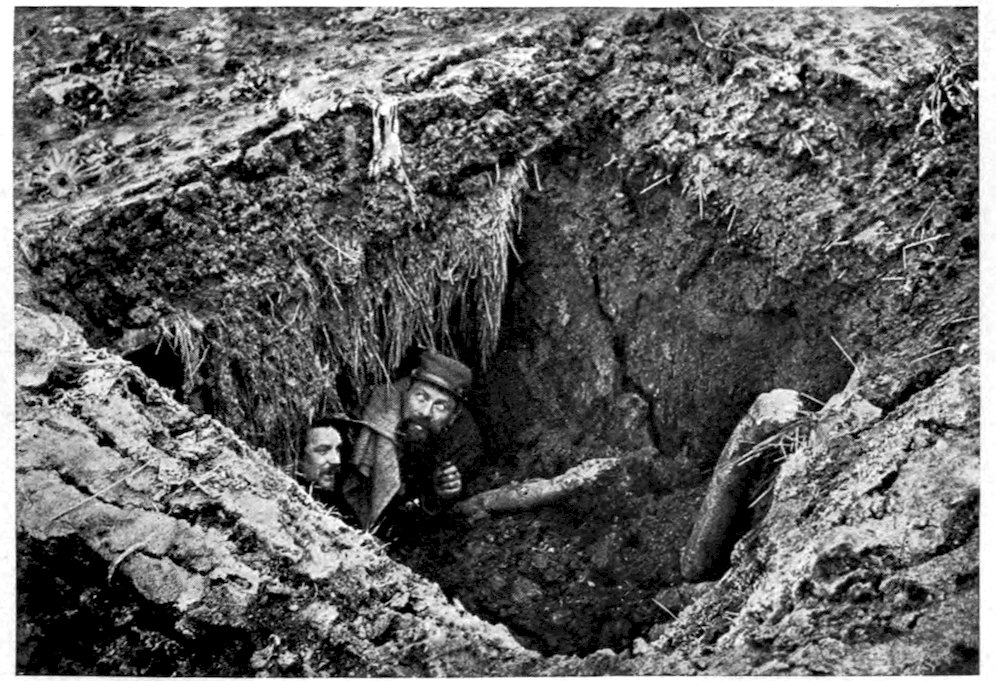 173The thing of which the Champagne battle-field most reminded me was a garbage-dump. It looked and smelled as though all the garbage cans in Europe and America had been emptied upon it. This region, as I have remarked before, is of a chalk formation, and wherever a trench had been dug, or a shell had burst, or a mine had been exploded, it left on the face of the earth a livid scar. The destruction wrought by the French artillery fire is almost beyond imagining. Over an area as long as from the Battery to Harlem and as wide as from the East River to the Hudson the earth is pitted with the craters caused by bursting 174shells as is pitted the face of a man who has had the small-pox. Any of these shell-holes was large enough to hold a barrel; many of them would have held a horse; I saw one, caused by the explosion of a mine, which we estimated to be seventy feet deep and twice that in diameter. In the terrific blast that caused it five hundred German soldiers perished. At another point on what had been the German first line I saw a yawning hole as large as the cellar of a good-sized apartment-house. It marked the site of a German blockhouse, but the blockhouse and the men who composed its garrison had been blown out of existence by a torrent of 370-millimetre high-explosive shells.