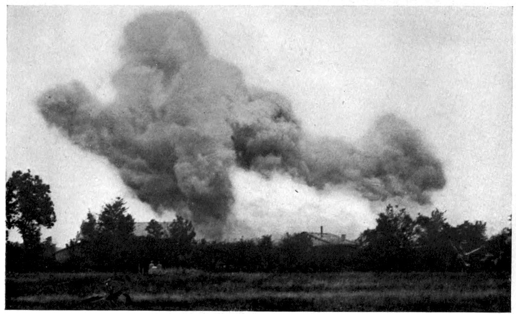Dawn was breaking over the Lorraine hills when the French aircraft were wheeled from their canvas hangars and ranged in squadrilla formation upon the level surface of the plain. In the dim light of early morning the machines, with their silver bodies and snowy wings, bore an amazing resemblance to a flock of great white birds which, having settled for the night, were about to resume their flight. All through the night the mechanicians had been busy about them, testing the motors, tightening the guy-wires, and adjusting the planes, while the pilots had directed the loading of the explosives, for a whisper had passed along the line of sheds that a gigantic air-raid, on a scale not yet attempted, was to be made on some German town. At a signal from the officer in command of the aviation field the pilots and observers, unrecognizable 191in their goggles and leather helmets and muffled to the ears in leather and fur, climbed into their seats. In the clips beneath each aeroplane reposed three long, lean messengers of death, the torpedoes of the sky, ready to be sent hurtling downward by the pulling of a lever, while smaller projectiles, to be dropped by hand, filled every square inch in the bodies of the aeroplanes. From somewhere out on the aviation field a smoke rocket shot suddenly into the air. It was the signal for departure. With a deafening roar from their propellers the great biplanes, in rapid succession, left the ground and, like a flock of wild fowl, winged their way straight into the rising sun. As they crossed the German lines at a height of twelve thousand feet the French observers could see, far below, the decoy aeroplanes which had preceded them rocking slowly from side to side above the German antiaircraft guns in such a manner as to divert their attention from the raiders.