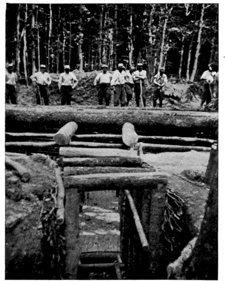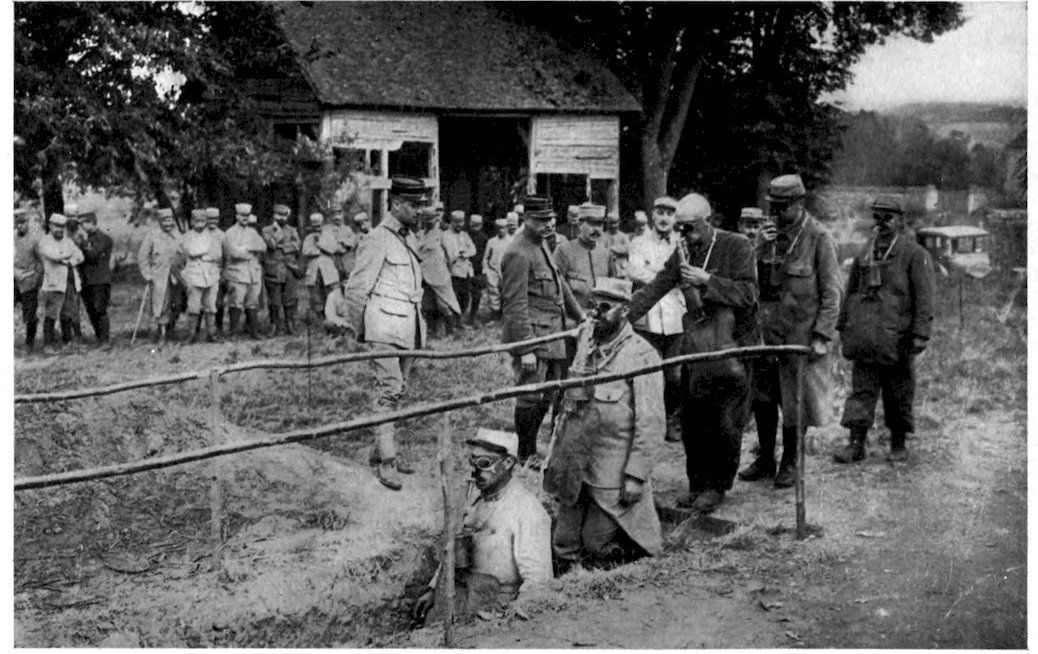 At various points behind the lines are schools where the men are instructed in the use of the anti-gas respirators.