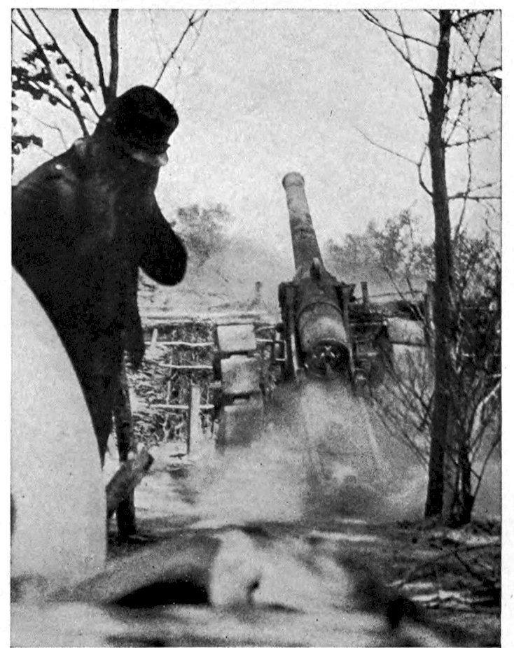 During the three days that I spent upon the battle-field of Champagne the roar of the guns never ceased and rarely slackened, yet not a sign of any human being could I see as I gazed out over that desolate plain on which was being 178fought one of the greatest battles of all time. There were no moving troops, no belching batteries, no flaunting colors—only a vast slag heap on which moved no living thing. Yet I knew that hidden beneath the ground all around me, as well as over there where the German trenches ran, men were waiting to kill or to be killed, and that behind the trench-scarred ridges at my back, and behind the low-lying crests in front of me, sweating men were at work loading and firing the great guns whose screaming missiles crisscrossed like invisible express trains overhead to burst miles away, perhaps, with the crash which scatters death. The French guns seemed to be literally everywhere. One could not walk a hundred yards without stumbling on a skilfully concealed battery. In the shelter of a ridge was posted a battery of 155-millimetre monsters painted with the markings of a giraffe in order to escape the searching eyes of the German aviators and named respectively Alice, Fernande, Charlotte, and Maria. From a square opening, which yawned like a cellar window in the earth, there protruded the long, lean muzzle of an eight-inch naval gun, the breech 179of which was twenty feet below the level of the ground in a gun-pit which was capable of resisting any high explosive that might chance to fall upon it. This marine monster was in charge of a crew of sailors who boasted that their pet could drop two hundred pounds of melinite on any given object thirteen miles away. But the guns to which the French owe their success in Champagne, the guns which may well prove the deciding factor in this war, are not the cumbersome siege pieces or the mammoth naval cannon, but the mobile, quick-firing, never-tiring, hard-hitting, “seventy-fives,” whose fire, the Germans resentfully exclaim, is not deadly but murderous.