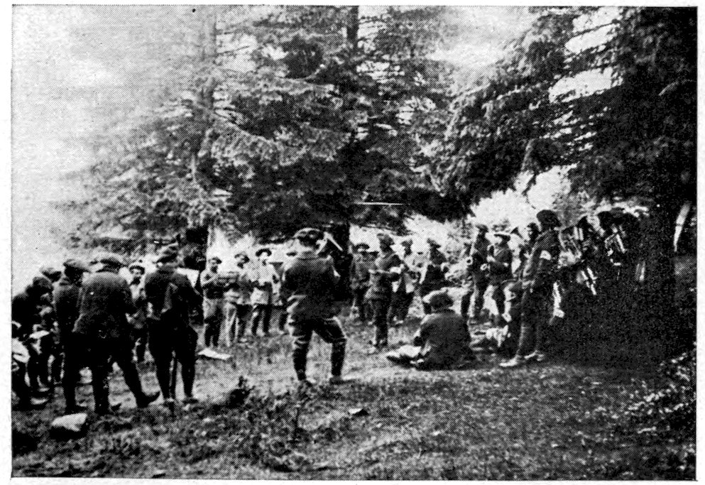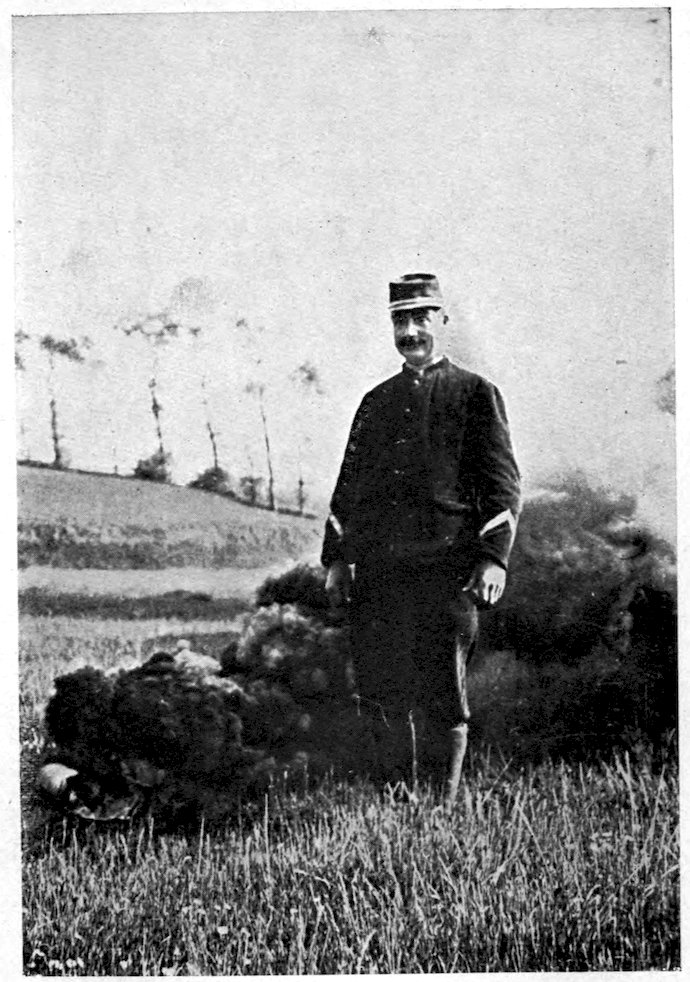 When only a short distance in the rear of the firing-line we left the car and proceeded on foot down a winding country road which debouched quite suddenly into a great, saucer-shaped valley. Its gentle slopes were checkered with the brown squares of fresh-ploughed fields and the green ones of sprouting grain. From beyond a near-by ridge came the mutter of artillery, and every now and then there appeared against the turquoise sky what looked like a patch of cotton-wool but was in reality bursting shrapnel. The far end of the valley was filled with what appeared at first glance 8to be a low-hanging cloud of gray-blue mist, but which, as we drew nearer, resolved itself into dense masses of troops drawn up in review formation—infantry at the right, cavalry at the left, and guns in the centre. I had heard much of the invisible qualities of the new field uniform of the French Army, but I had heretofore believed it to be greatly inferior to the German greenish gray. But I have changed my mind. At three hundred yards twenty thousand men could scarcely be distinguished from the landscape. The only colorful note was struck by the dragoons, who still retain their suicidal uniform of scarlet breeches, blue tunic, and the helmet with its horse-tail plume, though a concession has been made to practicality by covering the latter with tan linen. The majority of the French woollen mills being in the region held by the Germans, it has been possible to provide only a portion of the army with the new uniform. As a result of this shortage of cloth, thousands of soldiers have had recourse to the loose corduroy trousers common among the peasantry, while for the territorials almost any sort of a jacket will pass muster provided it is of a neutral color 9and has the regimental numerals on the collar. Those soldiers who can afford to provide their own uniforms almost invariably have them made of khaki, cut after the more practical British pattern, with cap-covers of the same material. Owing to this latitude in the matter of clothing, the French army during the first year of the war presented an extraordinarily variegated and nondescript appearance, though this lack of uniformity is gradually being remedied.