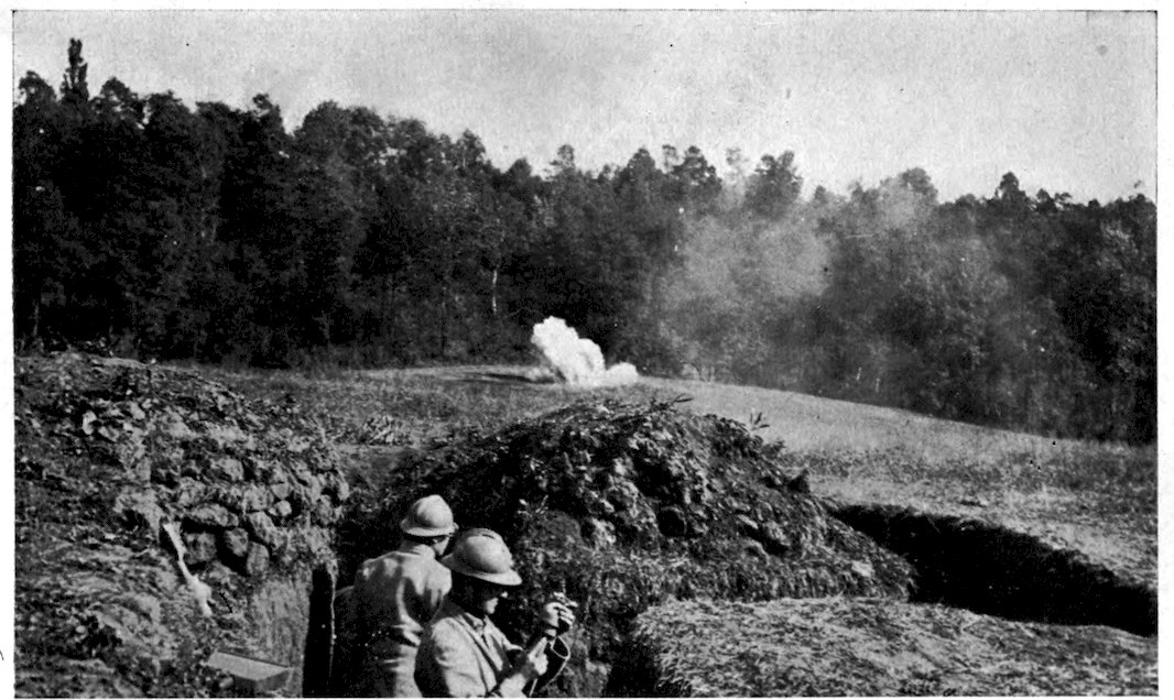 | French artillery officers, in an observatory on the Aisne, watching the effect of shell-fire on the German trenches | 19 | |