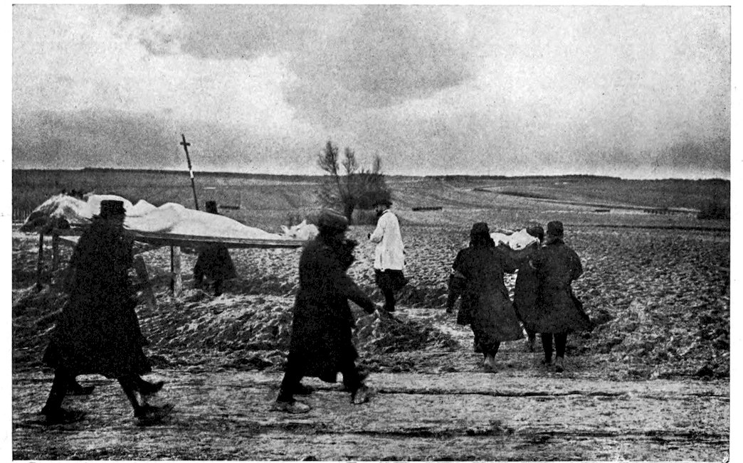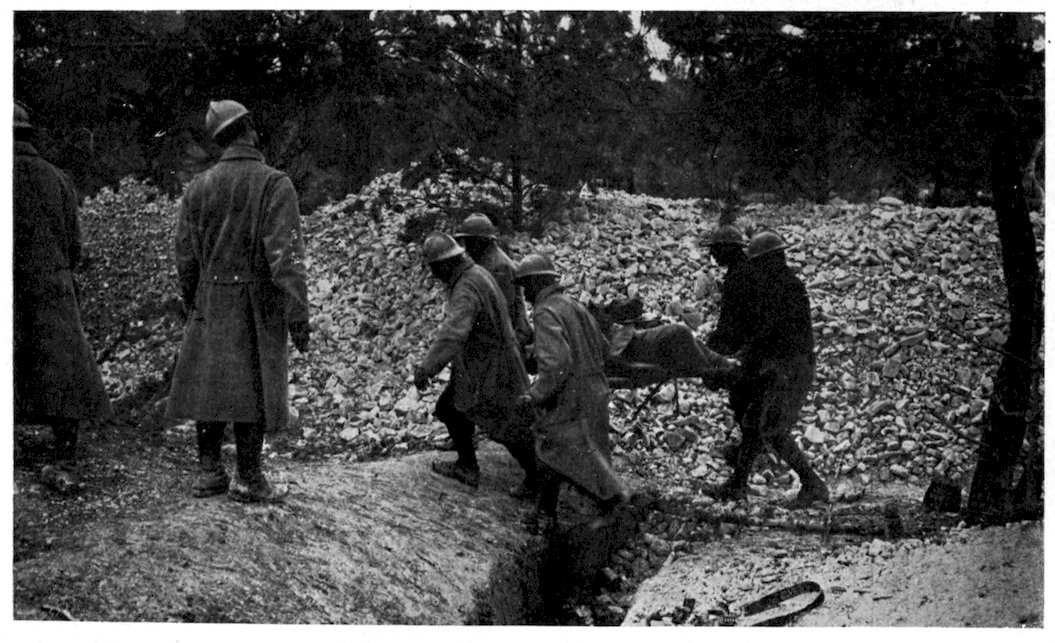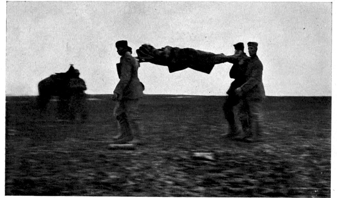 225As soon as a soldier falls he drags himself, if he is able, to some sheltered spot, or his comrades carry him there, and with the “first-aid” packet, carried in the breast pocket of the tunic, an endeavor is made to give the wound temporary treatment. In the British service this “first-aid” kit consists of a small tin box, not much larger than a cigarette-case, containing a bottle of iodine crystals and a bottle of alcohol wrapped up in a roll of aseptic bandage gauze. Meanwhile word has been passed along the line that the services of the surgeon are needed, for each regiment has one and sometimes two medical officers on duty in the trenches. It may so happen that the trench section has its own poste de secours, or first-aid dressing-station, in which case the man is at once taken there. The medical officer dresses the man’s wound, perhaps gives him a hypodermic to lessen the pain, and otherwise makes him as comfortable as possible under the circumstances. His wounds temporarily dressed, if there is a dug-out at hand, he is taken into it. If not, he is laid in such shelter as the trench affords, and there he usually has to lie until night comes and he 226can be removed in comparative safety; for, particularly in the flat country of Artois and Flanders, it is out of the question to remove the wounded except under the screen of darkness, and even then it is frequently an extremely hazardous proceeding, for the German gunners apparently do their best to drop their shells on the ambulances and stretcher-parties. As soon as night falls a dressing-station is established at a point as close as possible behind the trenches, the number of surgeons, dressers, and stretcher-bearers sent out depending upon the number of casualties as reported by telephone from the trenches to headquarters. The wounded man is transported on a stretcher or a wheeled litter to the dressing-station, where his wounds are examined by the light of electric torches and, if necessary, redressed. If he has any fractured bones they are made fast in splints or pieces of zinc or iron wire—anything that will enable him to stand transportation. Though the dressing-station is, wherever possible, established in a farmhouse, in a grove, behind a wall, or such other protection as the region may afford, it is, nevertheless, often in extreme 227danger. I recall one case, in Flanders, where the flashing of the torches attracted the attention of the German gunners, who dropped a shell squarely into a dressing-station, killing all the surgeons and stretcher-bearers, and putting half a dozen of the wounded out of their misery. As soon as the wounded man has passed through the dressing-station, he is carried, usually over very rough ground, to the point on the road where the motor-ambulances are waiting and is whirled off to the division ambulance, which corresponds to the field-hospital of the British and American armies. These division ambulances (it should be borne in mind that the term ambulance in French means “military hospital”) do as complete work as can be expected so near the front. They are usually set up only four or five miles back of the firing-line, and have a regular medical and nursing staff, instruments, and, in some cases, X-ray apparatus for operations. As a rule, only light emergency operations are performed in these ambulances of the front—light skull trepanning, removal of splintered bones, disinfection, and immobilizing of the wounded parts.