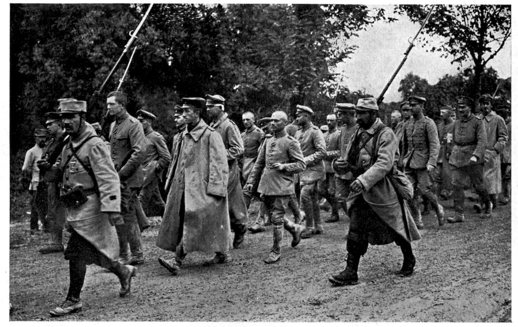 In many places the attacking columns found themselves abruptly halted by steel chevaux-de-frise, 171with German machine-guns spitting death from behind them. The men would pelt them with hand-grenades until the sappers came up and blew the obstructions away. Then they would sweep forward again with the bayonet, yelling madly. The great craters caused by the explosion of the French land mines were occupied as soon as possible and immediately turned into defensible positions, thus affording advanced footholds within the enemy’s line of trenches. At a few points in the first line the Germans held out, but at others they surrendered in large numbers, while many were shot down as they were running back to the second line. As a matter of fact, the Germans had no conception of what the French had in store for them, and it was not until their trenches began to give way under the terrible hammering of the French artillery that they realized how desperate was their situation. It was then too late to strengthen their front, however, as it would have been almost certain death to send men forward through the curtain of shell-fire which the French batteries were dropping between the first and second lines. Nor were the Germans 172prepared when the infantry attack began, as was shown by the fact that a number of officers were captured in their beds. The number of prisoners taken—twenty-one thousand was the figure announced by the French General Staff—showed clearly that they had had enough of it. They surrendered by sections and by companies, hundreds at a time. Most of them had had no food for several days, and were suffering acutely from thirst, and all of them seemed completely unstrung and depressed by the terrible nature of the French bombardment.