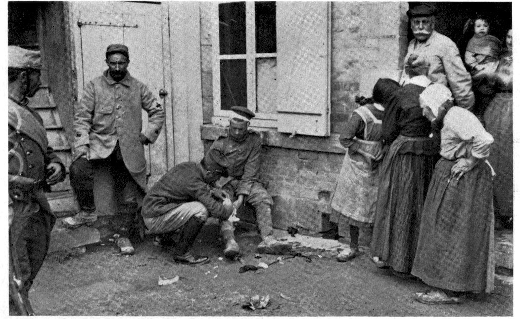 As we entered Bailleul they were bringing in the harvest. They were bringing it in motor-cars, many, many, many of them, stretching in endless procession down the yellow roads which lead to Lille and Neuve Chapelle and Poperinghe and Ypres. Over the gray bodies of the motor-cars were gray canvas hoods, and painted on the hoods were staring scarlet crosses. The curtain at the back of each car was rolled up, and protruding from the dim interior were four pairs of feet. Sometimes those feet were wrapped in bandages, and on the fresh white linen were bright-red splotches, but more often they were incased in worn and muddied boots. I shall never forget those poor, broken, mud-incrusted boots, for they spoke so eloquently of utter weariness and pain. There was something about them that was the very essence of pathos. The owners of those boots were lying on stretchers which were made to slide into the ambulances as drawers slide into a bureau, and most of them were suffering agony such as only a woman in childbirth knows.