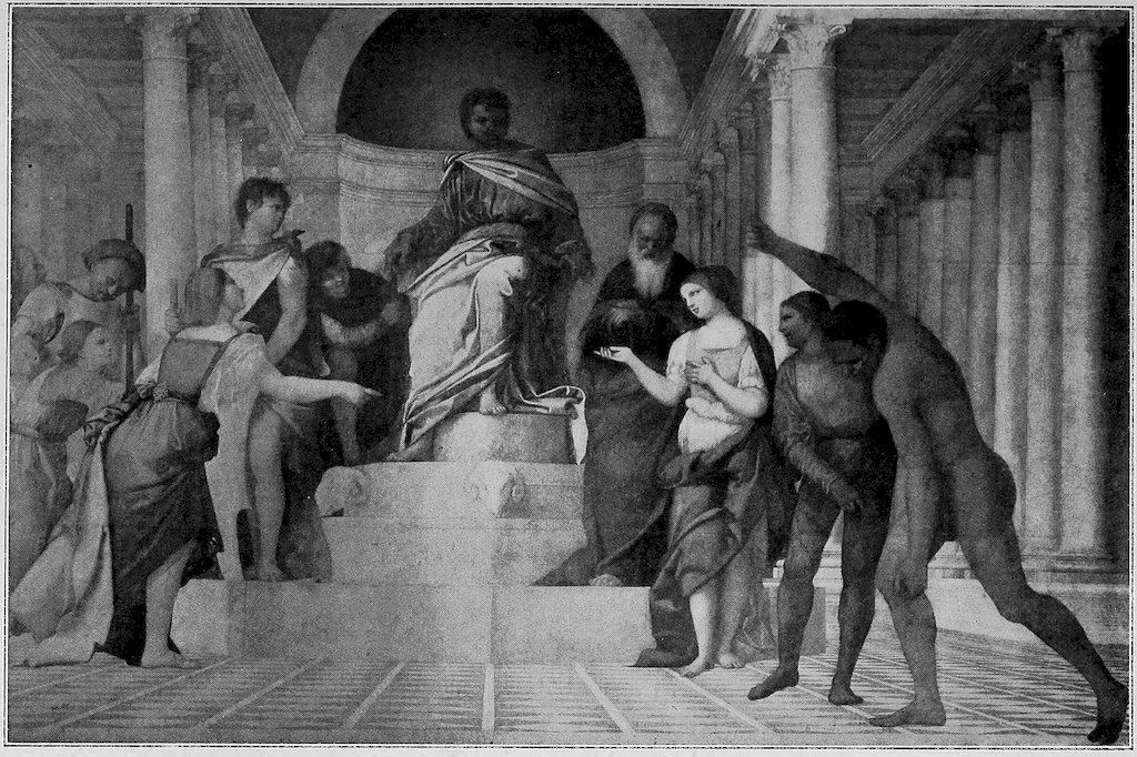 51. Berenson in the first edition of his little book on Venetian Painting did not mention it either, but in the third edition he passes it by with these words: “The scarcely less famous picture belonging to Mr. Banks is by the hand which painted the Christ and Adulteress, of the Glasgow Corporation Gallery, and that hand is Giovanni Cariani’s. To repeat, I would have preferred to publish opinions so divergent from those usually received, in a form adequate to the importance of the theme; but I console myself with the belief that the merest indication suffices the competent. As for the others—Procul o procul este, profani.”