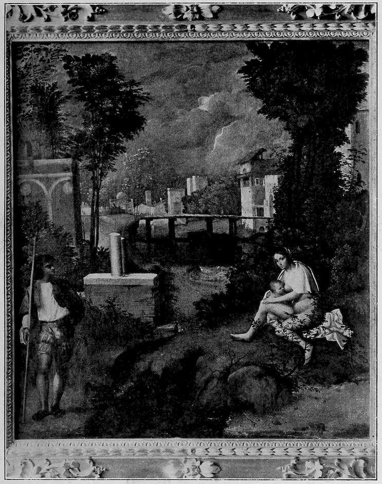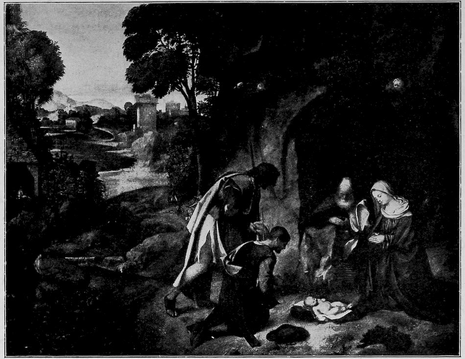 Giorgione used none of the affected graces or sentimentalities of Raphael, nor did he depend upon such weirdness as Leonardo chose; as a result, his figures are as much more satisfying to the inquiring intellect as a living fountain is compared with the mirage of the desert. His means are simple. There is no exaggeration of action, as in the Titian Child, but all is essentially delicate and infantine. There is no exaggeration of expression, but a slightly dreamy, far-away look as of powers still unwakened, and one feels, as before no other representations of the Child, that such as He might 206attain to even Calvary. Taken in connection with the agreement of the details, this spiritual similarity of the work to others that we know are by Giorgione must give him pause who should think to name Titian as the author.[77]