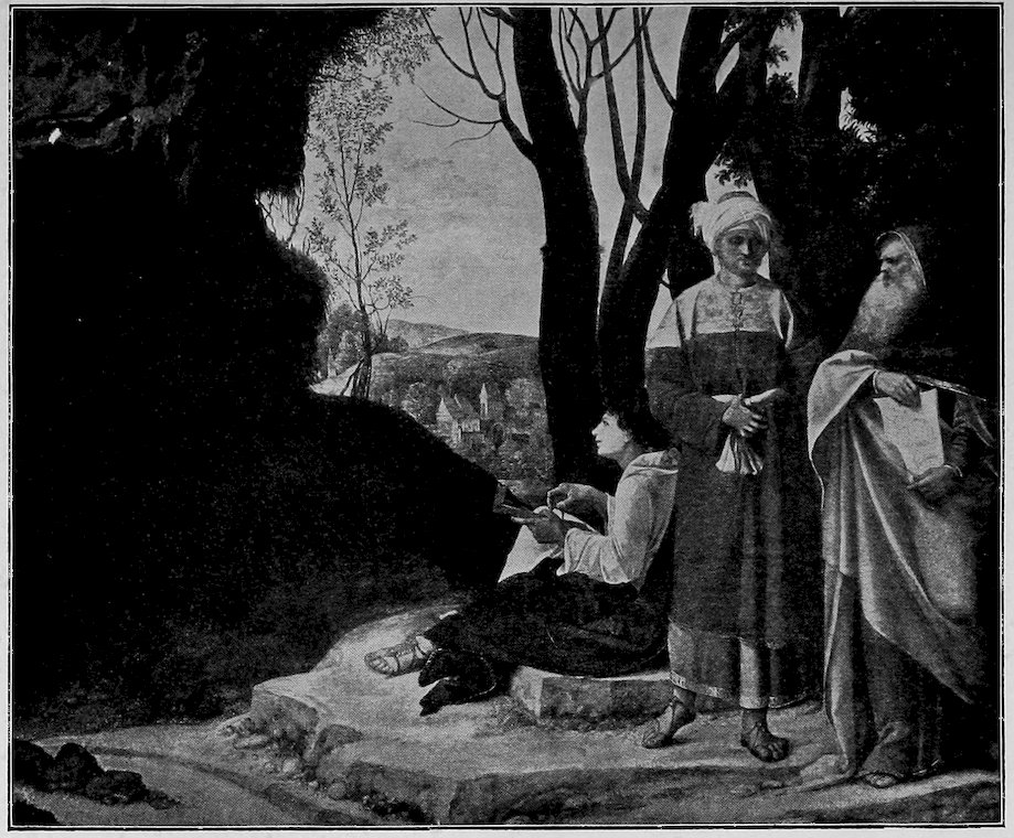 Always steadily reaching for the same goal, this even-poised master did not one day paint such exalted figures as Bellini’s Virgin and Companion Saints in the Frari, and on another such heathen festivities as the same master’s Bacchanal. But, as he loved music and pleasant company and such pleasantnesses of life, so in his painting he shows us grace and harmony and good breeding. And as these things are hard to find in our daily course and harder still to fix long enough to paint their semblance, he fashioned for himself a world, an Arcadia, where men and women, surrounded by beautiful Nature, lived together, enjoying a life where there was both work and play. In all temperate reason they employ their energies now on problems of deep thought, and now in the satisfaction of health and natural bodily enjoyment, and it is just because of the reasonableness of this balance of mind and body that his pictures seem poetic, dreamlike and difficult to explain. As Keats, more than any scientist or idle dreamer, tells how the nightingale entrances the soul, so Giorgione depicts the Virgin and her Child guarded by attendant Saints, or adored by kings and slaves, with greater 213persuasiveness than any theologian. But he does this neither as one diverted only by the pageantry, nor as an historian. Endowed with a poet’s instinct, he saw the deeper meaning of the scene and depicted those parts that truly illustrate it.