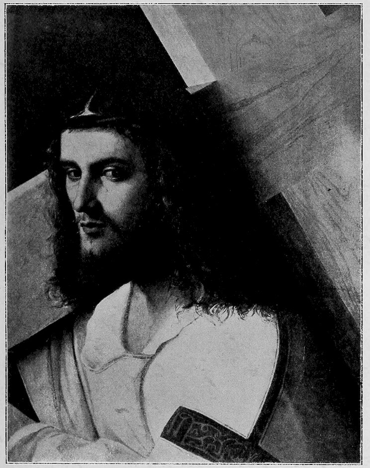 The heads of the figures of the dead Christ in the works of Bellini are without exception represented as asleep. In the Correr picture one sees more than sleep in the closed eyes and drawn mouth of the Saviour. There is death—but death, the tragedy, so combined with a yearning, soul-compelling 208sadness, that the face can never be forgotten by whoso once has seen it, and this is spiritual life. Scarcely any other artist ever equalled Giorgione, and none certainly ever surpassed him, in the power of representing the members of the Holy Family. There are many fine presentations of Christ bearing the Cross, but none so imaginative as the Vicenza picture. For there we see in the sensitive face, the direct eye, and steady earnest mouth, the signs of completed power over self, while in the tear drop that sparkles on the cheek is the sign of suffering that broke the body, whose soul it could not quell—for neither brow nor eye are those of one who weeps. The Correr painting contains a similar double suggestion. Two details there are also which bear out the idea that Giorgione is the author. One is the technique which so far as can be seen is of the rich, smooth, carefully shaded kind, peculiar to Giorgione’s work. The other is the landscape in which the low horizon line and the plumy trees correspond closely to his certain works. Wreck though it be, and possibly only a copy of the original, it is worth study by students.[79]
