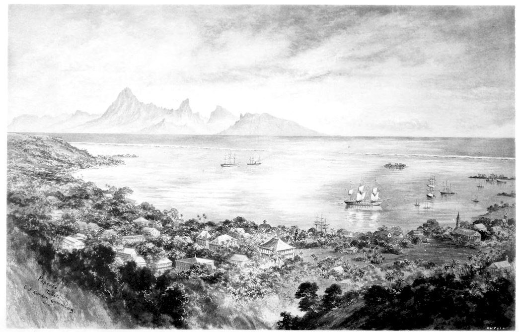 The annexation of Tahiti was formally proclaimed in Papeete on 24th March 1881, and was made the occasion of a brilliant festival, such as the light-hearted crowds are ever ready to welcome. Great were the official rejoicings. From every ship in the harbour, and every corner of the town, floated the tricolour, which likewise adorned the raven tresses of the women and the button-holes of the men. Great was the noise of big guns, and the amount of powder expended on salutes. An imposing column of all branches of the service—sailors and marines, marine artillery, with their guns, infantry, and gendarmes—marched round the town, headed by the band: “A Tahiti, comme en France, on aime à voir passer nos soldats,” says the ‘Messager de Tahiti.’ So the lovely town was en fête. Every himène chorus had arrived from every corner of the isles, making the whole air musical. Thousands of natives, all in their brightest, freshest dresses, kept up incessant movement in the clear sunlight or cool shade. Everywhere games and feasting were the order of the day. In the governor’s beautiful gardens, a brilliant banquet for upwards of a hundred persons was served in a great tent, all as graceful as the combined taste of France and Tahiti could make it. Then followed a lovely garden festival, just such as that described by “The Earl and the Doctor,” a gay ball for the leading inhabitants, while “the people” danced no less joyously on the green, outside the sacred precincts. Games, music, dancing, and feasting, with a night of brilliant illuminations and fireworks,—all these, combined with lovely surroundings and perfect weather, made the great official festival of Tahiti a day which the French naval officers very naturally consider one to be remembered for ever, but which, perchance, may have caused some of the older inhabitants an angry and bitter pang, for the independence of their country thus lost for ever.