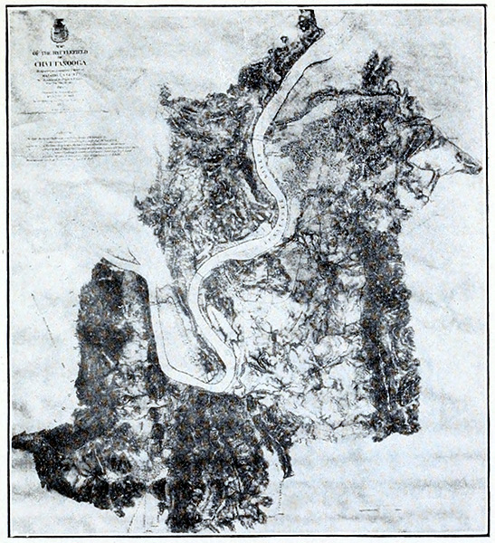 Map of the battlefield of Chattanooga showing the position of the Confederate Army at Lookout Mountain and Mission Ridge.