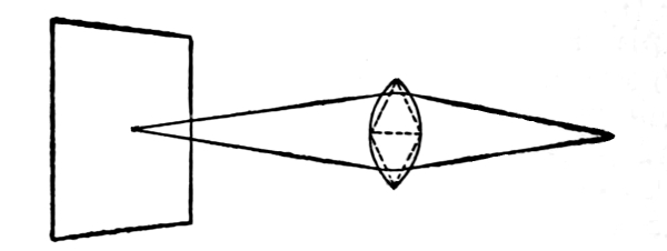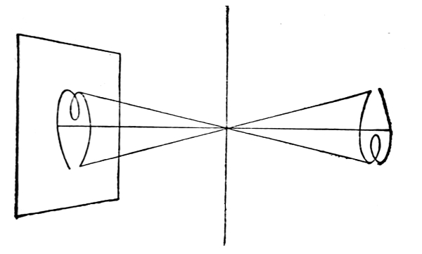 PINHOLE LENS. The simplest lens which we could use would be a small hole. If we take a sheet of cardboard and make a hole in it with a pin and then in a darkened room, hold the cardboard between a sheet of white paper and an electric lamp we shall see on the paper an image [Pg 11] of the lamp’s filament. The same principle is applied to the making of pinhole photographs. A very fine smooth hole is made in a piece of thin brass or tin-foil and this is used in place of the lens. The diagram (Figure 1) shows how the image is formed by the use of the pinhole.