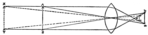 FORMATION OF AN IMAGE BY A LENS. When a ray of light passes through a prism it is bent as it enters the glass and again as it leaves it. The lens works very much the same as two prisms. [Pg 12]