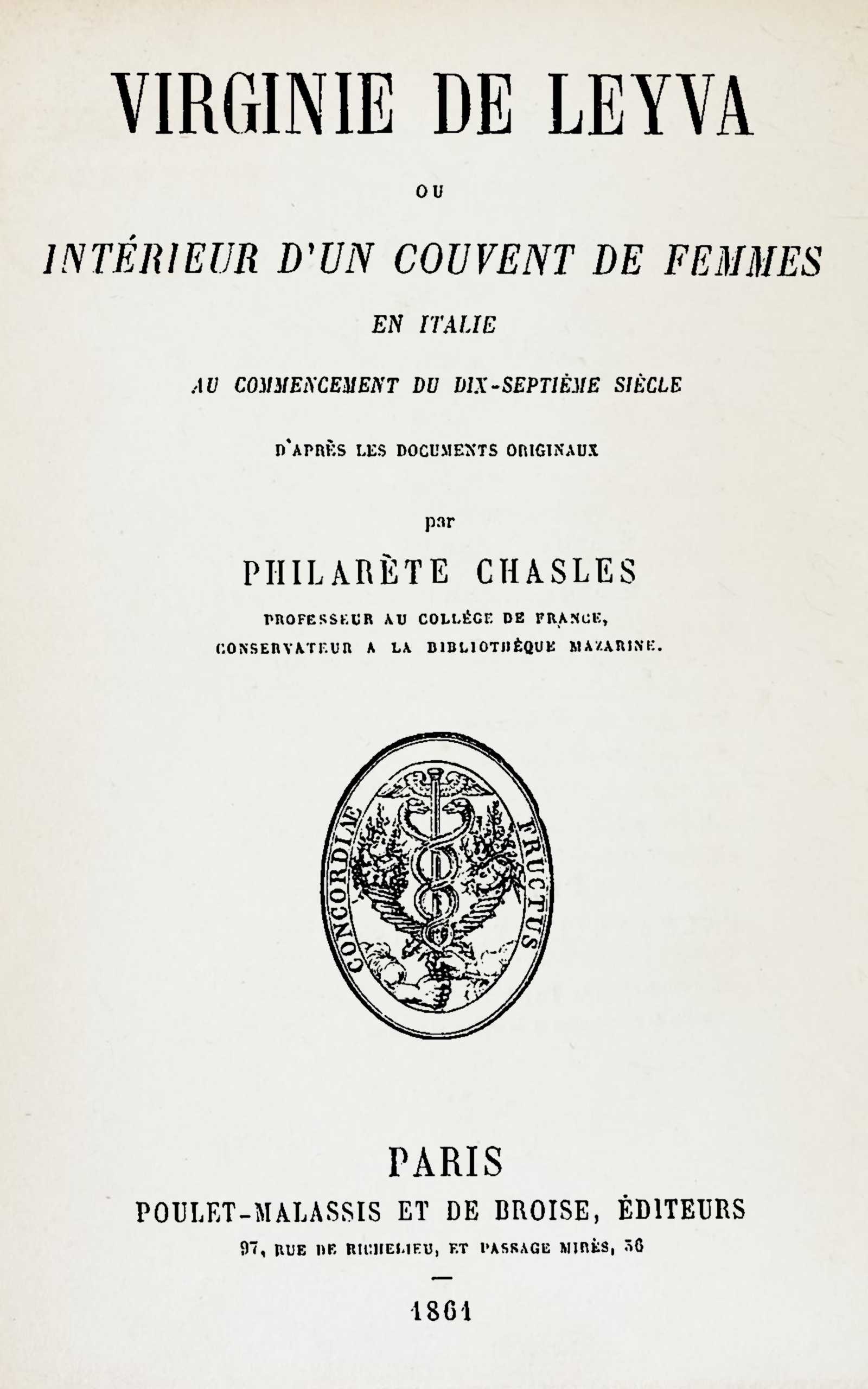 Ce sont toujours les femmes qui caractérisent les mœurs. Ici le témoin et le symbole du temps est une religieuse, espagnole de race, italienne par l’éducation ; la Signora di Monza, — de son vivant et en religion Suor Virginia Maria, — petite-fille d’Antoine de Lève, ou de Leyva, dont parle Brantôme.