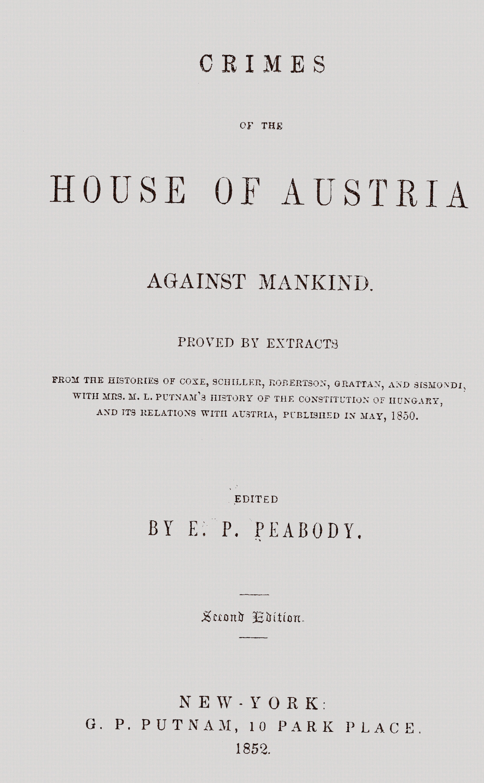 The present volume will principally consist of a series of extracts from different historical works, in which the crimes of the House of Hapsburgh against liberty and law are incidentally related. There seems to be a call, just now, that the testimony of History upon this subject should be laid before the American people. Their heart is touched by the events of the last three years, and it is well that their sensibility should have the support of their reason, enlightened by the truth, that they may not be the victims of every newspaper paragraph which venal partisans of the cause of legitimacy in Europe may have the art to insinuate into the current periodicals; and which presume upon the common ignorance in this country, of the details of European history, that comes to us at best only through books written more or less in the spirit of monarchy. A history of Europe written from the republican point of view, a history of nations and not of their governors, is the desideratum for the people of these United States. But such a work requires both genius and integrity of soul to conceive, and a vast industry properly to execute, the discovery of the exact truth being infinitely the greatest part of the labor required. We may only avail ourselves at this moment of such history as is written, and if something of the force of the statement is lost by the fragmentary nature of our work, on the other hand something will be gained to the argument from the consideration, that the passages brought as witnesses were not written primarily to serve the object to which we direct them. They are largely taken from conservative writings. Archdeacon Coxe gathered his materials in Vienna, and himself states that “to this family Europe owes its preservation,” and that it has “formed the great bulwark of political freedom!” To the tissue of violence 4and rapacity which forms the life of each successive head of the family, he always appends an EULOGY, sometimes ludicrously in contrast with the facts he has related, but which is presumptive evidence that he would not make those facts worse than they were. From the first chapter of his History of the House of Austria we extract the origin of the family, with a memoir which elucidates the personal character of the author of the letter to the pope, quoted above. We abridge all we extract by making as many omissions as possible; but the exploring of the sources from which we make our extracts will show that the omissions in no instance falsify the facts related. We purposely leave out the false coloring which the author’s own remarks sometimes give to these facts, together with the numerous episodes which make the narrative heavy, and weaken the moral impression of it, by scattering and wearying the attention.