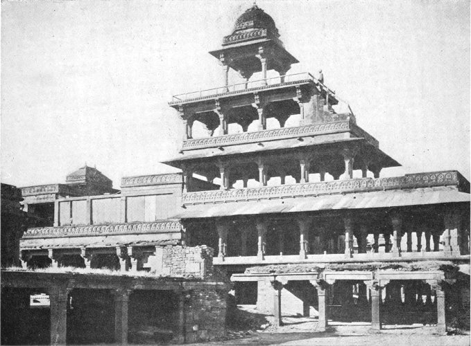 [3] “The following account of Akbar’s Pachisi-board is from an old Agra periodical:—The game is usually played by four persons, each of whom is supplied with four wooden or ivory cones, which are called ‘gots,’ and are of different colours for distinction. Victory consists in getting these four pieces safely through all the squares of each rectangle into the vacant place in the centre,—the difficulty being that the adversaries take up in the same way as pieces are taken at backgammon. Moving is regulated by throwing ‘cowries,’ whose apertures falling uppermost or not, affect the amount of the throw by certain fixed rules. But on this Titanic board of Akbar’s, wooden or ivory ‘gots’ would be lost altogether. Sixteen girls, therefore, dressed distinctively—say four in red, four in blue, four in white, four in yellow—were trotted up and down the squares, taken up by an adversary, and put back at the beginning again; and at last, after many difficulties, four of the same colour would find themselves gliding into their dopattas together in the middle space, and the game was won.”—Bholanauth Chunder.