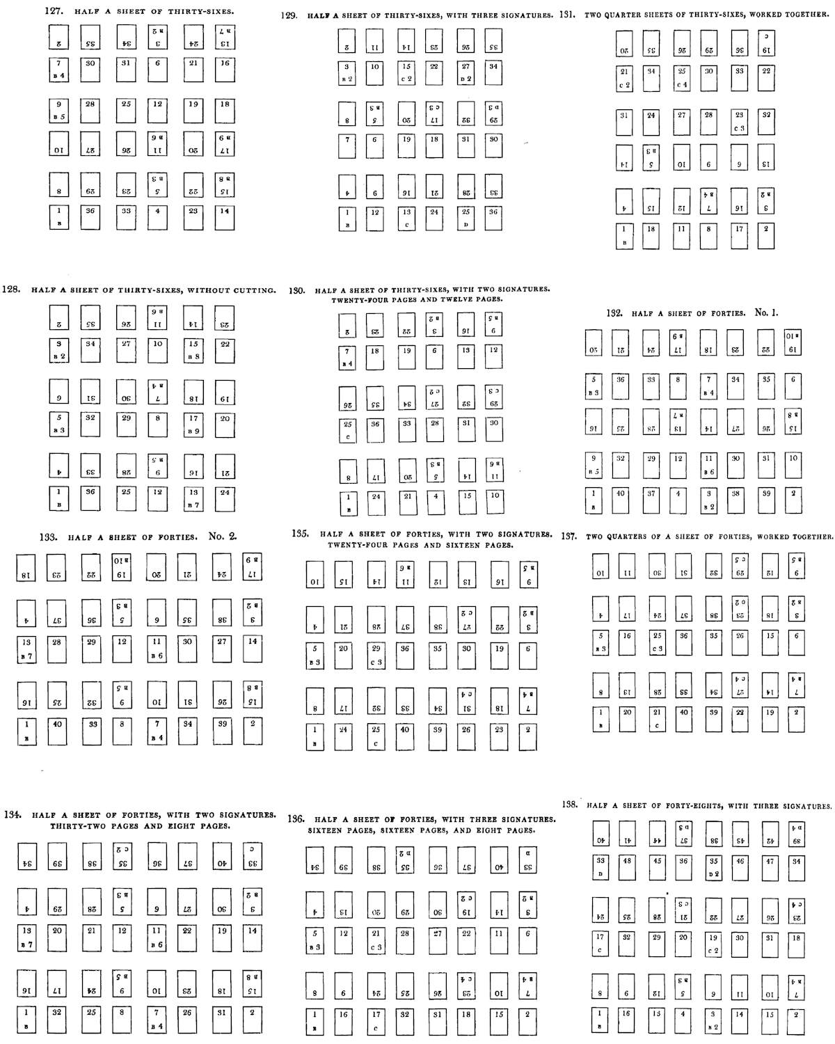 Tables of Imposition on p335 to p400. The first three pages are displayed as searchable tables, the remaining sixty-three pages are displayed as small Illustrations. Many of the numerical signatures on a page were printed upside down in the original book. This is indicated in this etext (on those first three pages of tables) by putting the number in brackets, for example [14] or [B2].