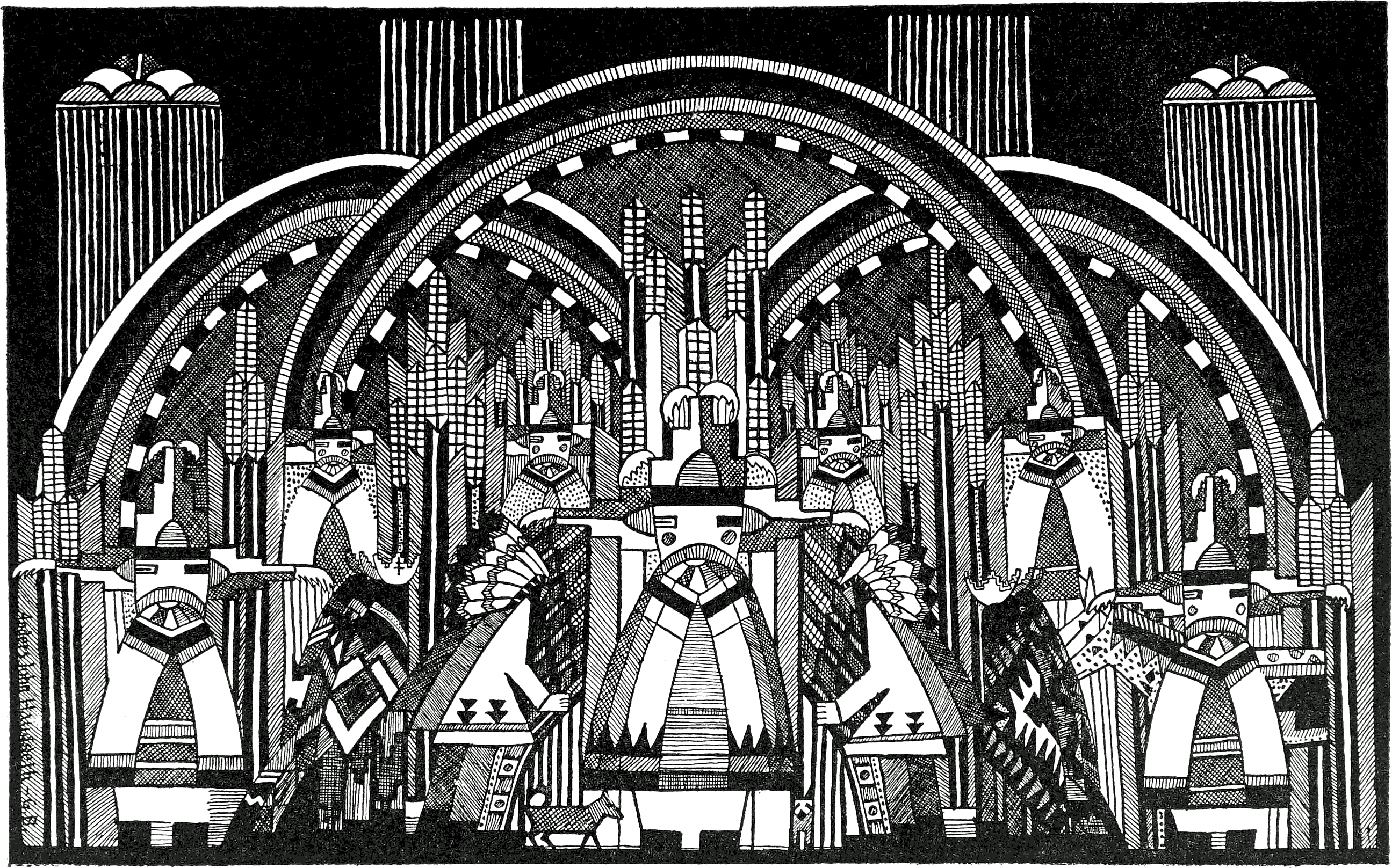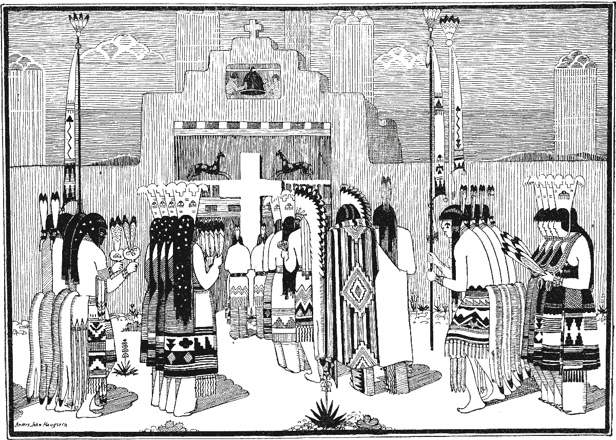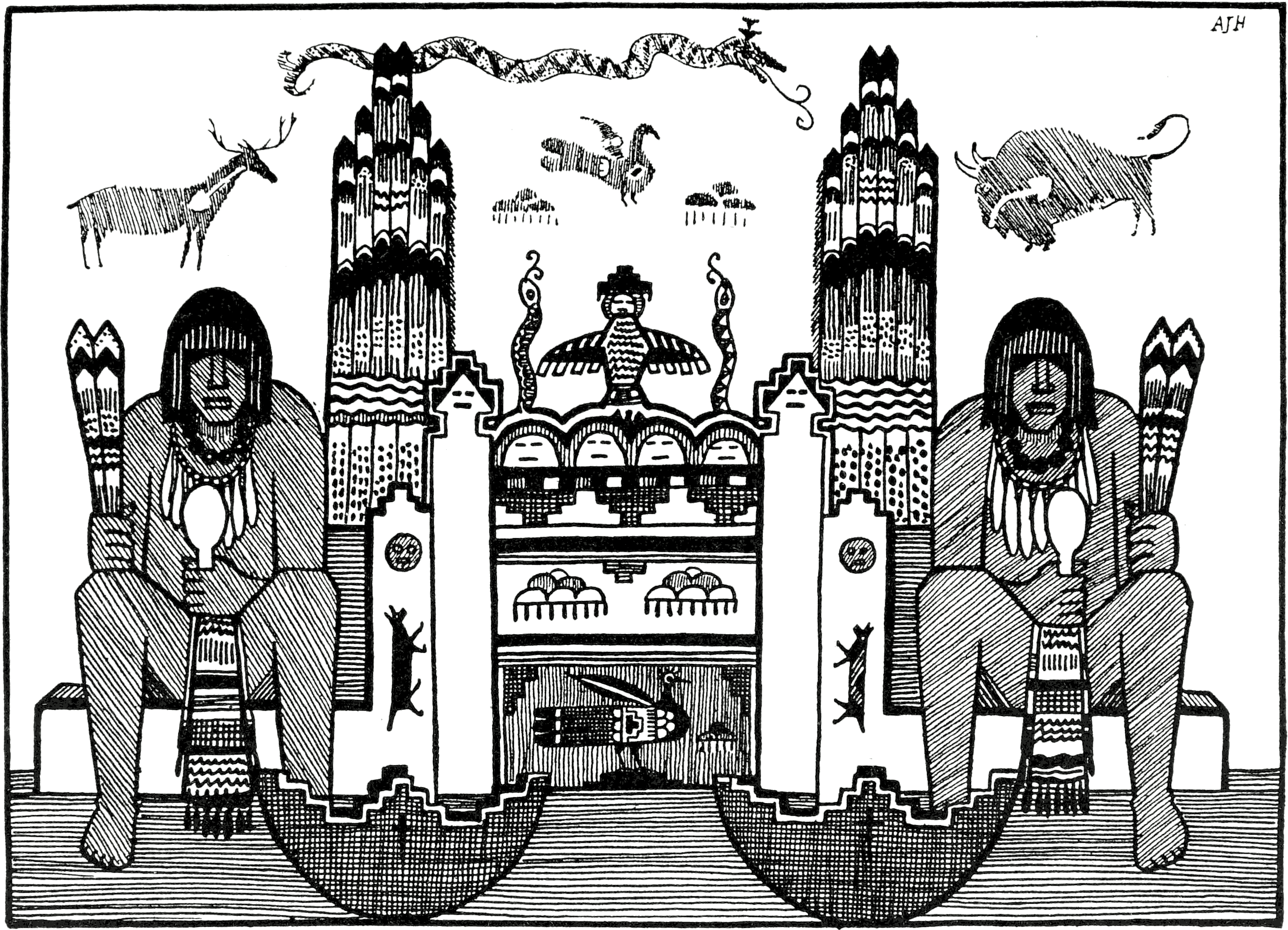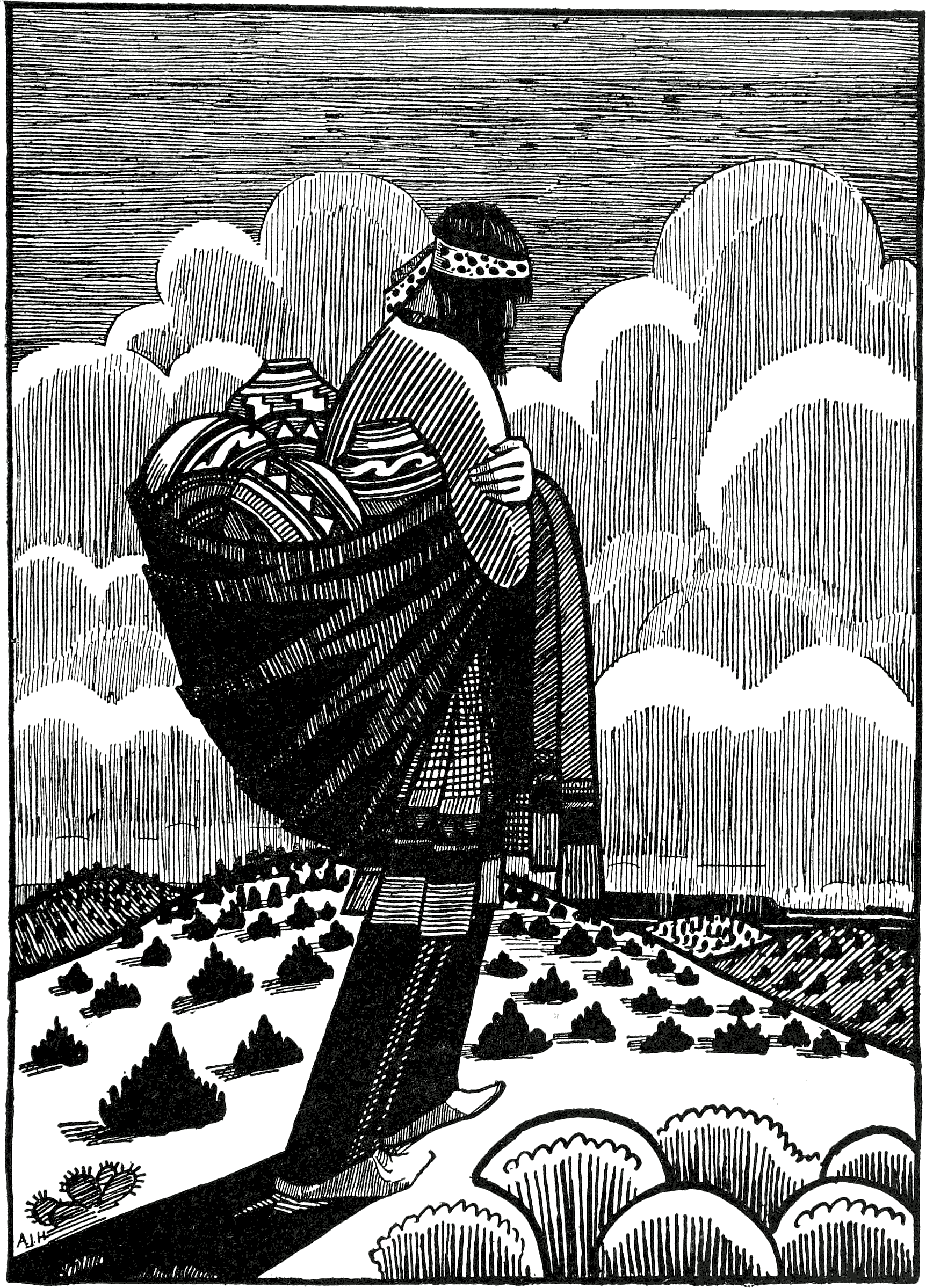 Earth’s Terraced Bowl is an interpretation of the imagery of this Pueblo art-in-life. Its purpose is to aid in our comprehension of a beautiful and ancient culture, setting the coloristic and symbolic elements into relationship with the life which they express. The site described is the plateau above the Rio Grande, at the foot of the Sangre de Cristo range, where Santa Fé is built over the ruins of an ancient pueblo, and in its modern development is bringing into new expression the art and architecture of the ancient peoples. The images chosen are, first, the Pueblo woman potter, fashioning her ceremonial bowl, of which the terraced rim is emblem of the cloud-terraces that rise above the mountains in ever-changing variety; second, the man drilling emblematic beads of shell and turquoise, of jet and abalone, such as these Indians have used from beyond the dawn of history; third, the great mid-summer dance, now devoted to the mystery of the union of heaven and earth as it appears in vegetation and in the life which is dependent upon vegetation; and fourth, the festivals of fertility and of harvest, which complete, as it were, the definition of the life of man in this simple setting.