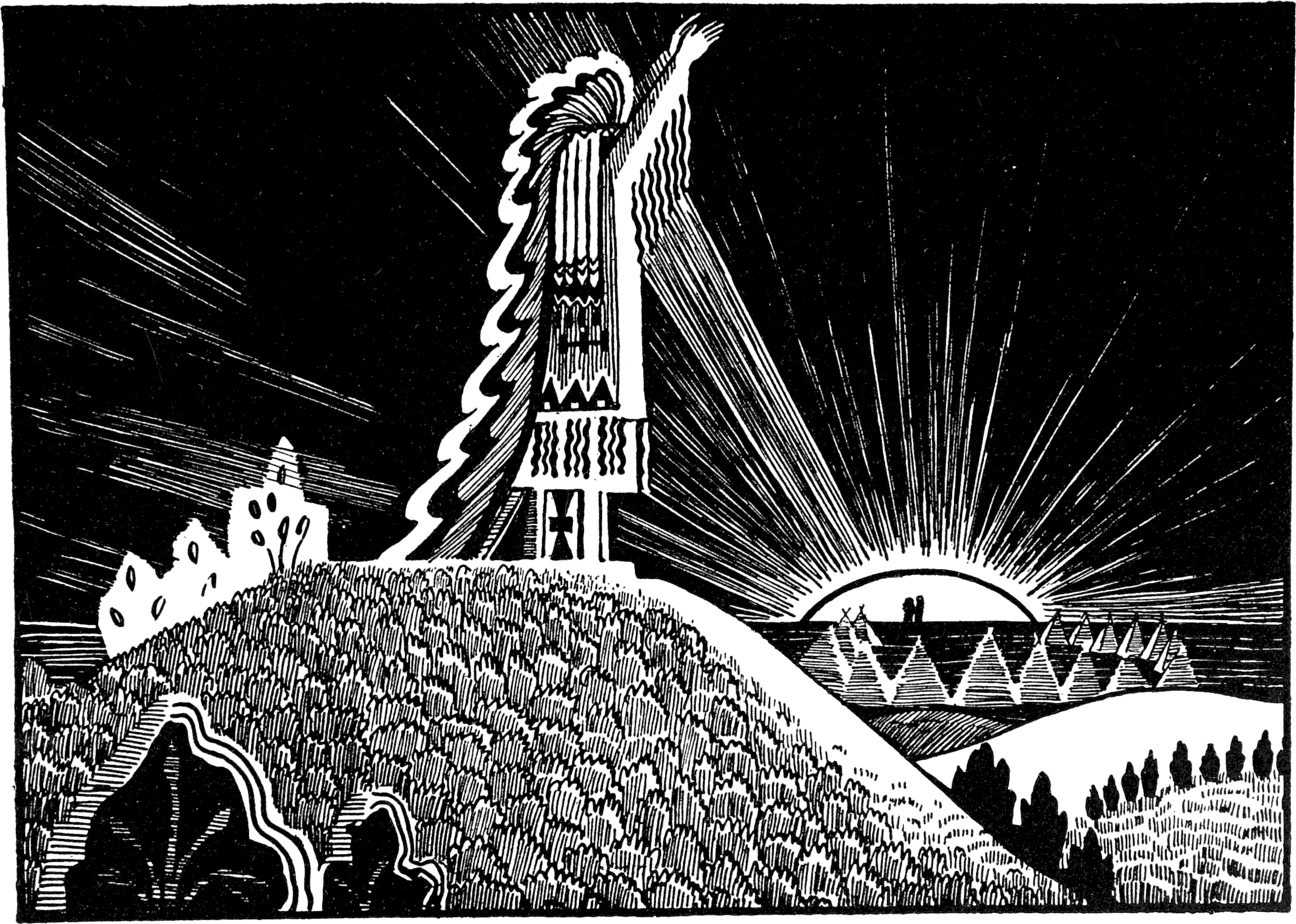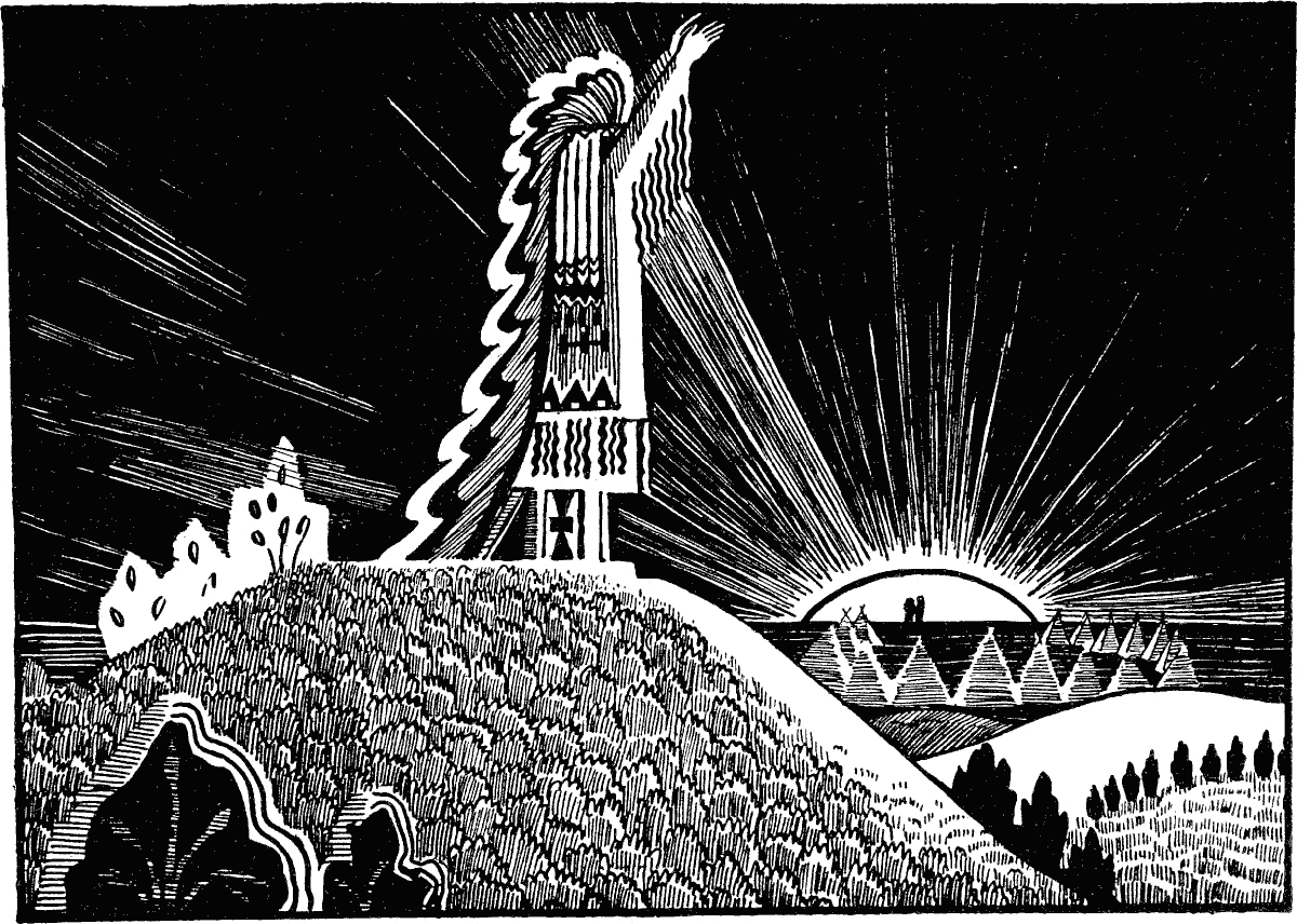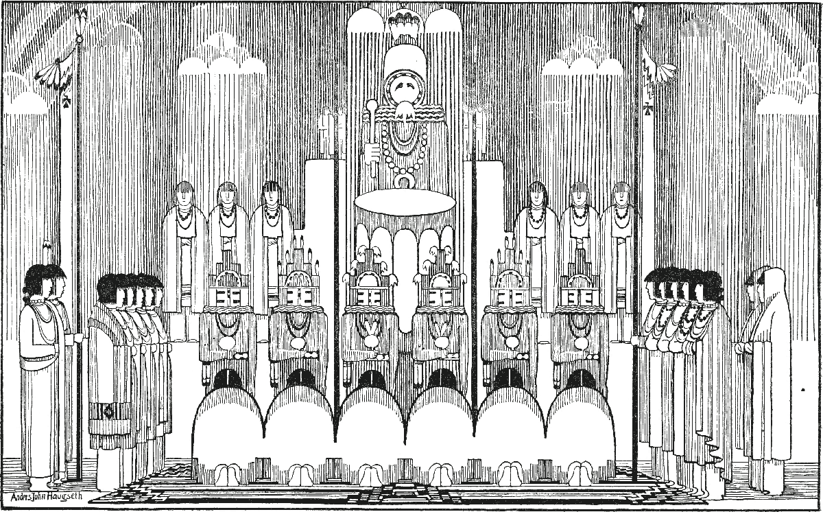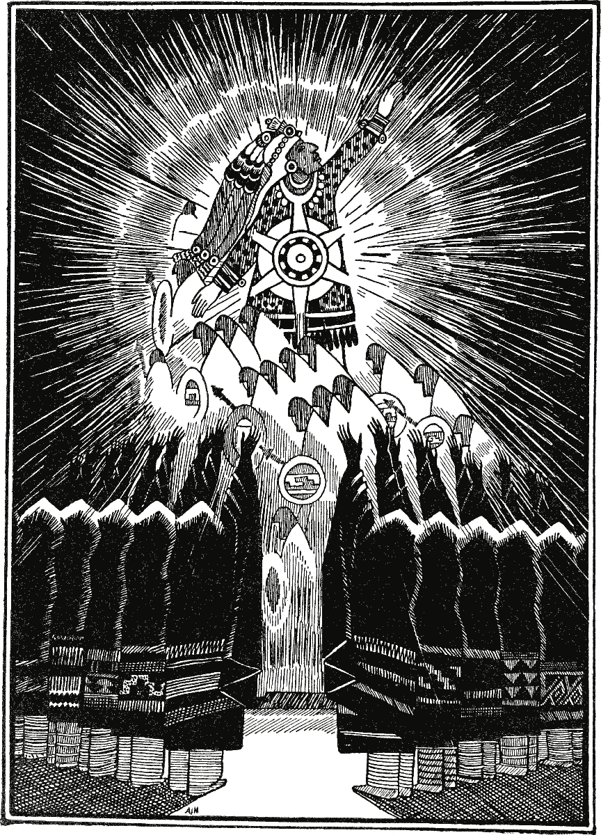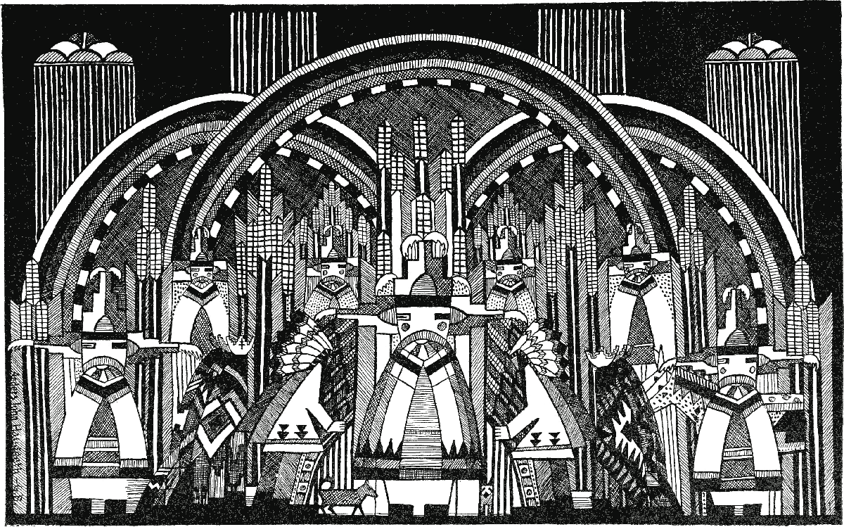 Earth’s Terraced Bowl is an interpretation of the imagery of this Pueblo art-in-life. Its purpose is to aid in our comprehension of a beautiful and ancient culture, setting the coloristic and symbolic elements into relationship with the life which they express. The site described is the plateau above the Rio Grande, at the foot of the Sangre de Cristo range, where Santa Fé is built over the ruins of an ancient pueblo, and in its modern development is bringing into new expression the art and architecture of the ancient peoples. The images chosen are, first, the Pueblo woman potter, fashioning her ceremonial bowl, of which the terraced rim is emblem of the cloud-terraces that rise above the mountains in ever-changing variety; second, the man drilling emblematic beads of shell and turquoise, of jet and abalone, such as these Indians have used from beyond the dawn of history; third, the great mid-summer dance, now devoted to the mystery of the union of heaven and earth as it appears in vegetation and in the life which is dependent upon vegetation; and fourth, the festivals of fertility and of harvest, which complete, as it were, the definition of the life of man in this simple setting.