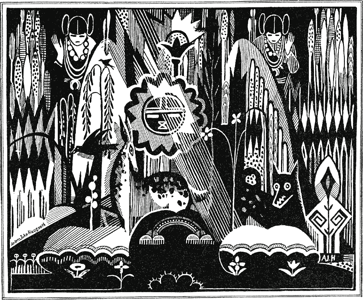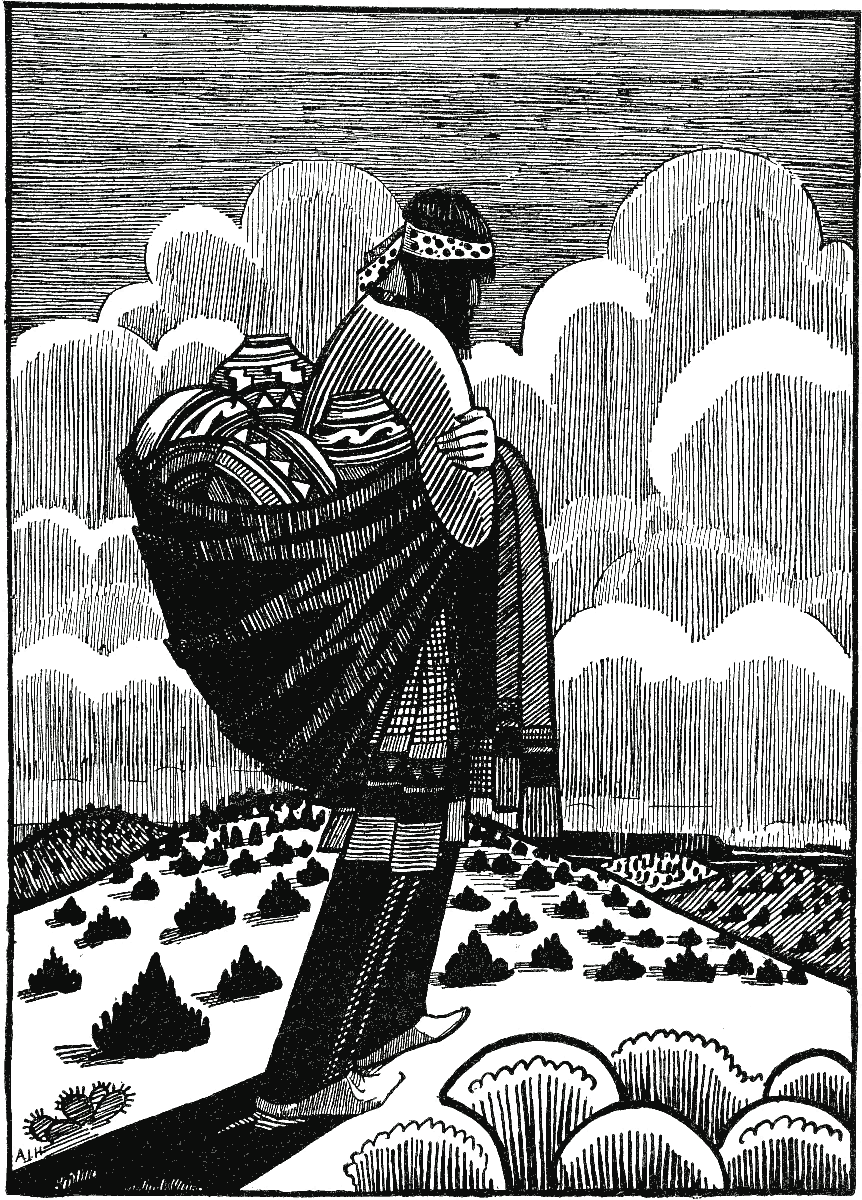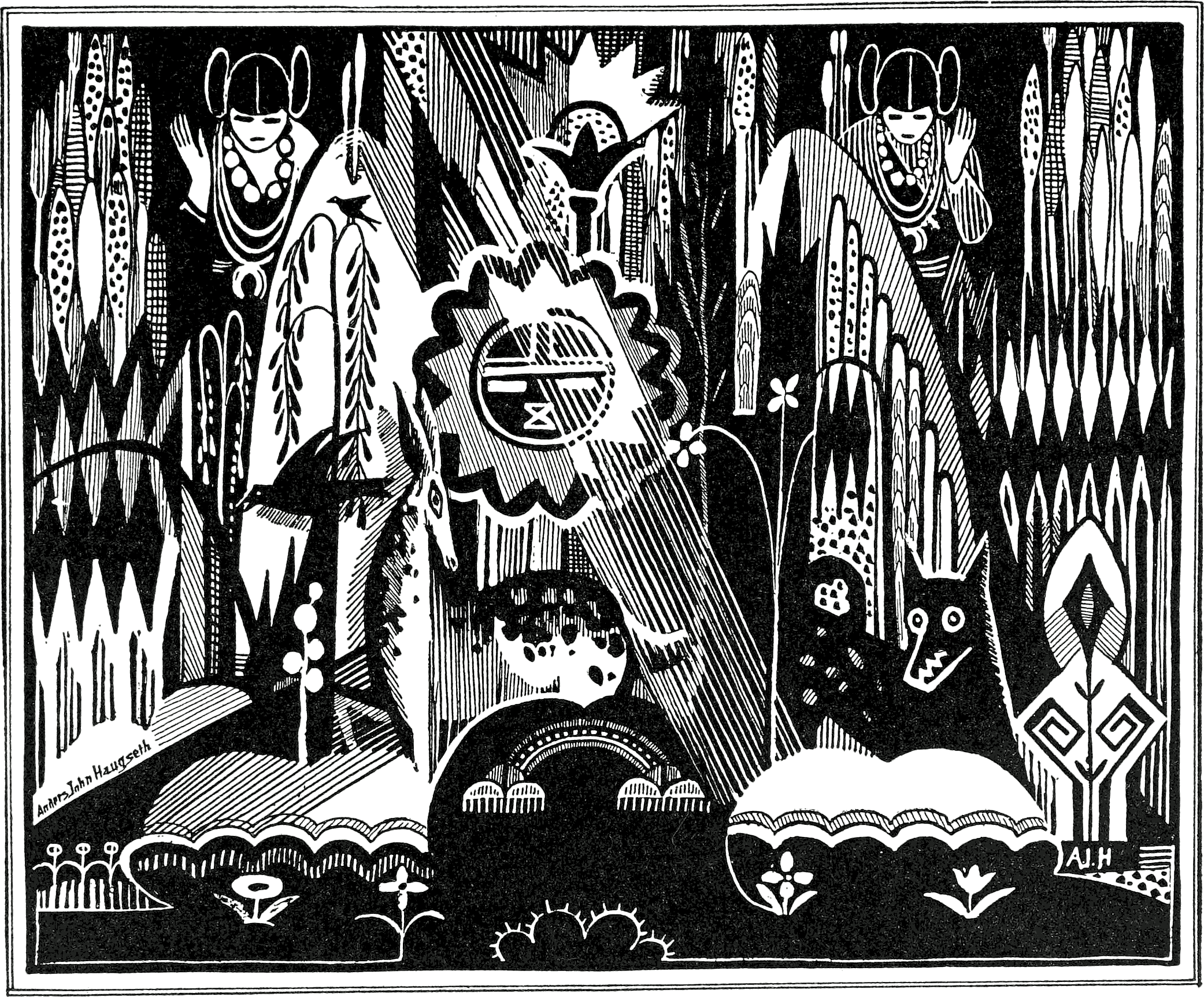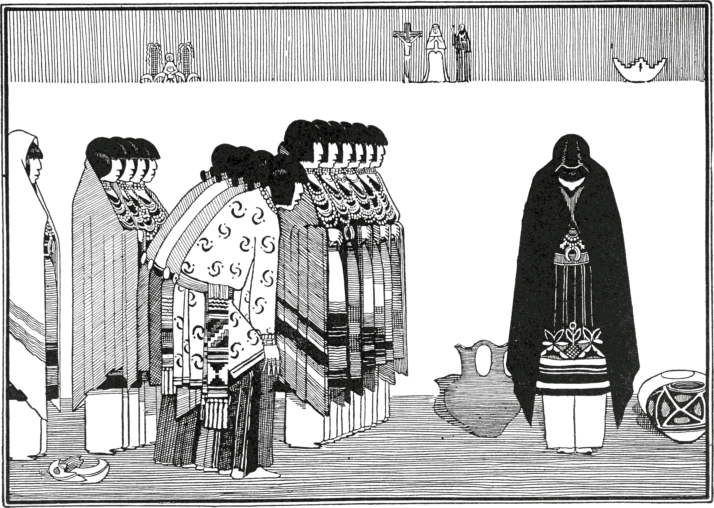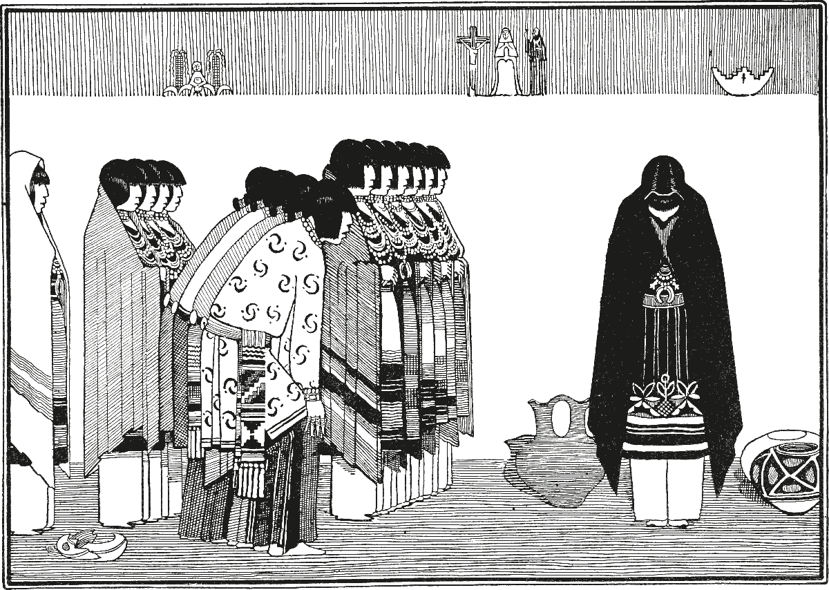 The art of the Pueblo Indians is so intimately woven into the pattern and fabric of their lives that it can hardly be called an art. It is never merely ornamental, and therefore dispensable; it is the intrinsic and indispensable mode of performing the essential acts of living, and its technique is an immediate reflection of the conditions of life. The forms which adorn the painted olla are those cloud, vegetation, and life forms which are spontaneously associated with the thought of water—a thought which is ever-present among these agriculturists in an arid country. The beads which trick out festal costumes are talismans, emblematic in the very nature of their materials and hues; and the colors which are ceremonially significant are the colors which Nature makes so varied and vivid in the soil and sky and vegetation of the Southwest. Dances themselves are as much in the character of agricultural operations and political duties as of festal holidays; and the Powers and Forces which to us are superstitions or personifications are for them normal presences. We speak of art and symbolism in connection with their modes of aesthetic expression because these are the terms with(104) which we most nearly describe them; but it is always important in interpreting such an art to bear in mind that it has little in common, spiritually, with what in our own culture is analogous to it.