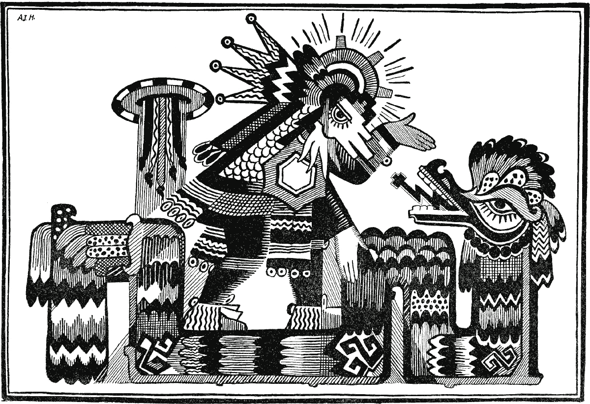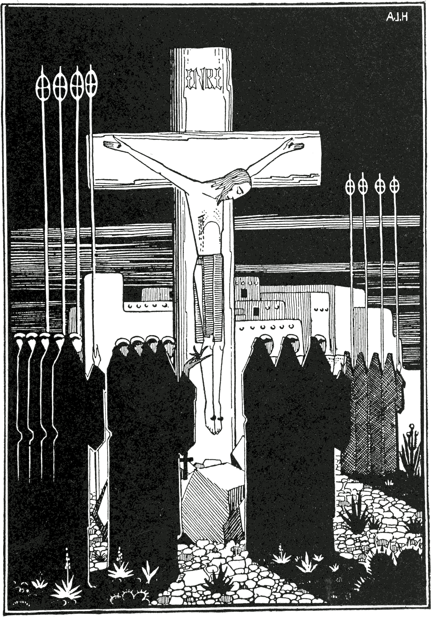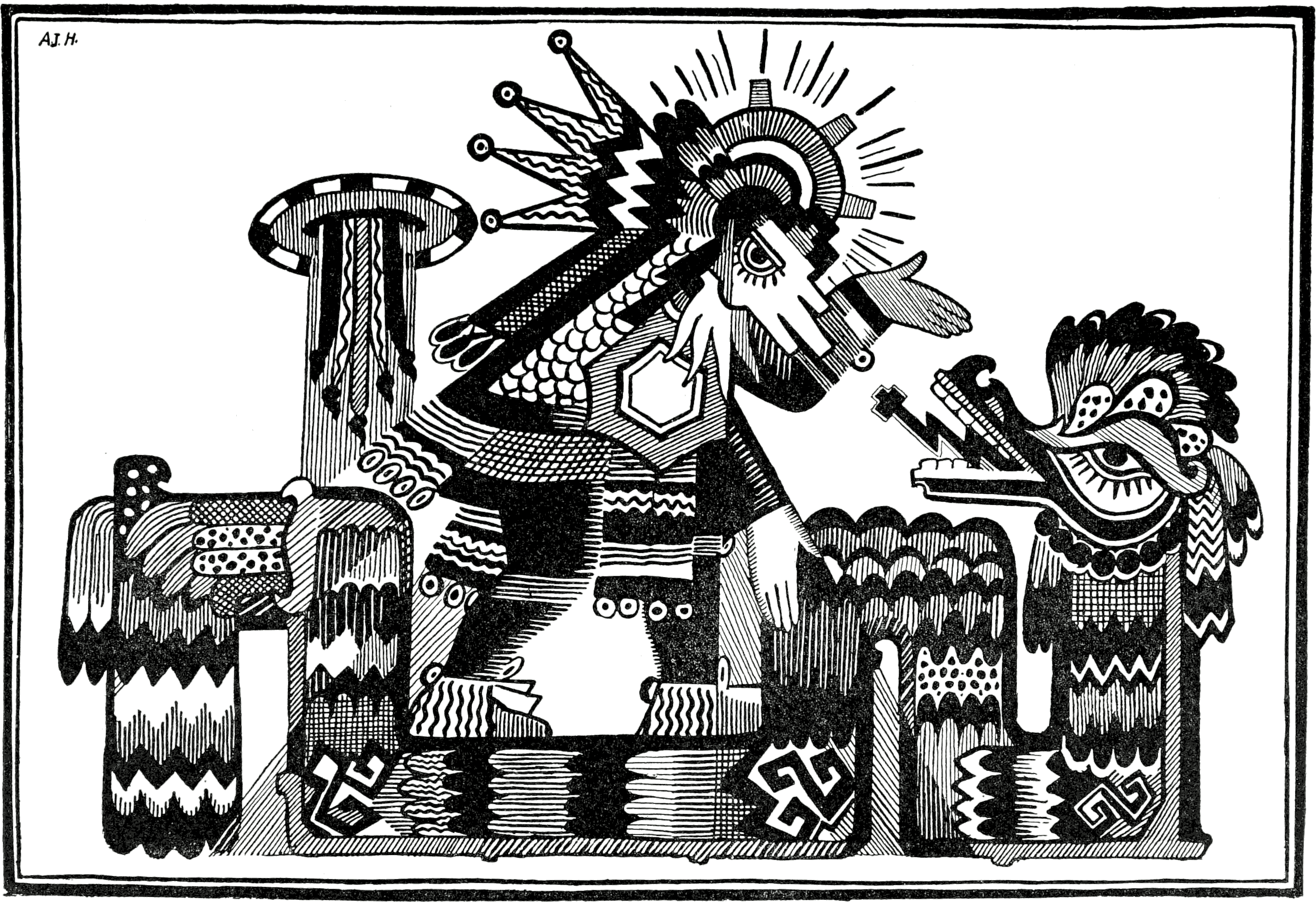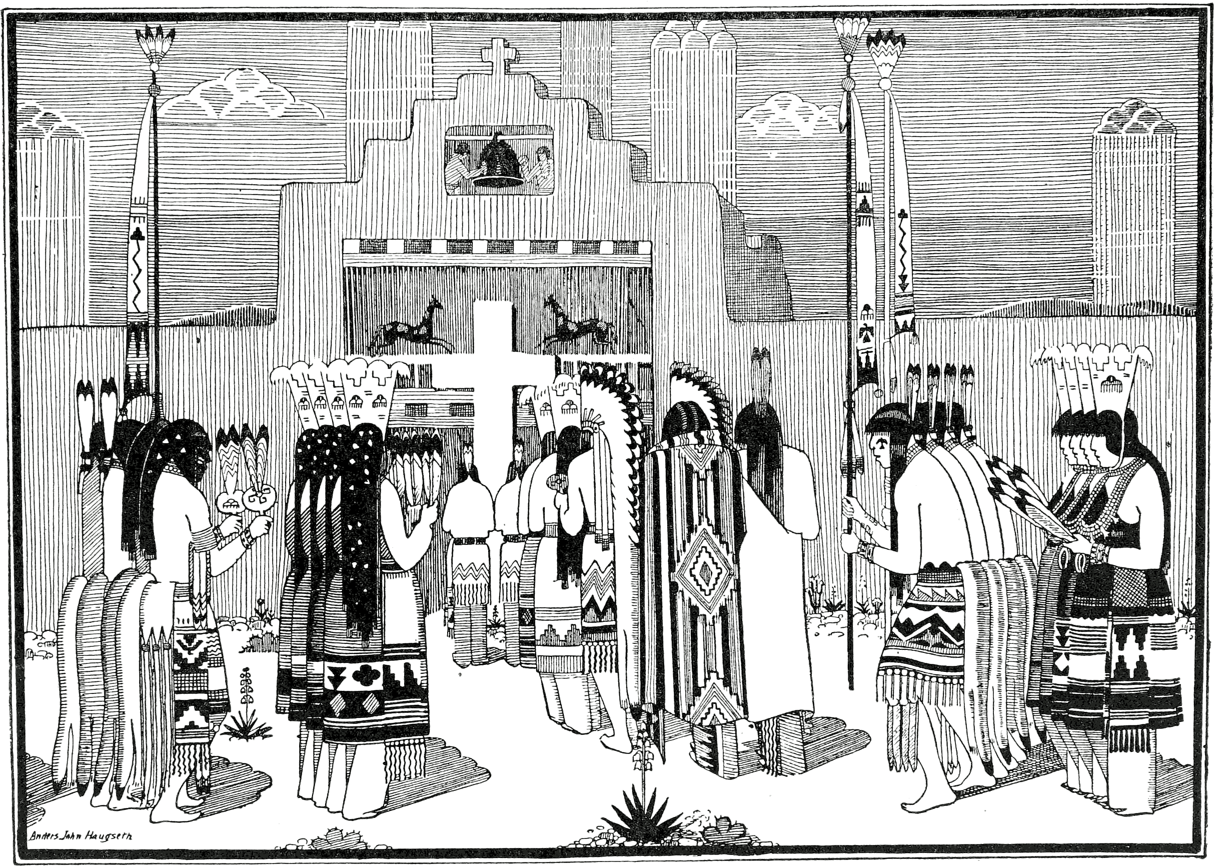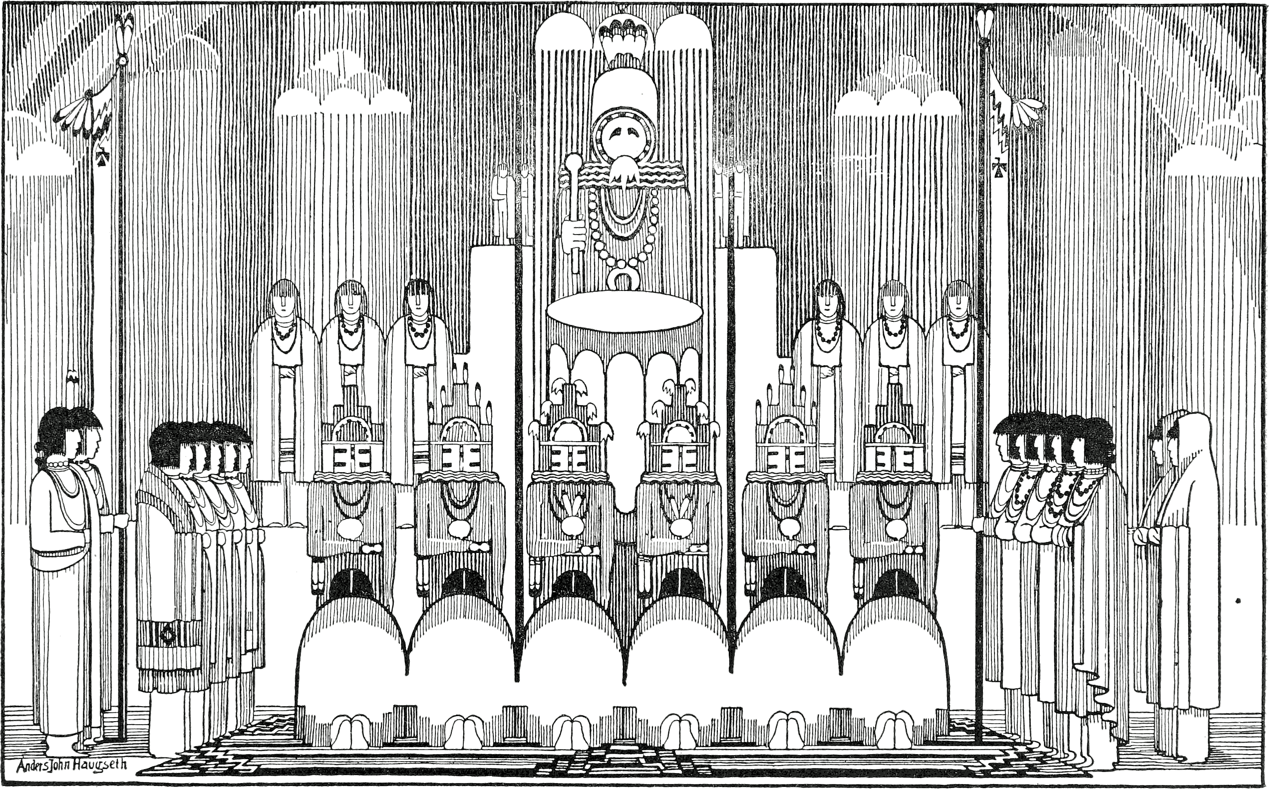 The art of the Pueblo Indians is so intimately woven into the pattern and fabric of their lives that it can hardly be called an art. It is never merely ornamental, and therefore dispensable; it is the intrinsic and indispensable mode of performing the essential acts of living, and its technique is an immediate reflection of the conditions of life. The forms which adorn the painted olla are those cloud, vegetation, and life forms which are spontaneously associated with the thought of water—a thought which is ever-present among these agriculturists in an arid country. The beads which trick out festal costumes are talismans, emblematic in the very nature of their materials and hues; and the colors which are ceremonially significant are the colors which Nature makes so varied and vivid in the soil and sky and vegetation of the Southwest. Dances themselves are as much in the character of agricultural operations and political duties as of festal holidays; and the Powers and Forces which to us are superstitions or personifications are for them normal presences. We speak of art and symbolism in connection with their modes of aesthetic expression because these are the terms with(104) which we most nearly describe them; but it is always important in interpreting such an art to bear in mind that it has little in common, spiritually, with what in our own culture is analogous to it.