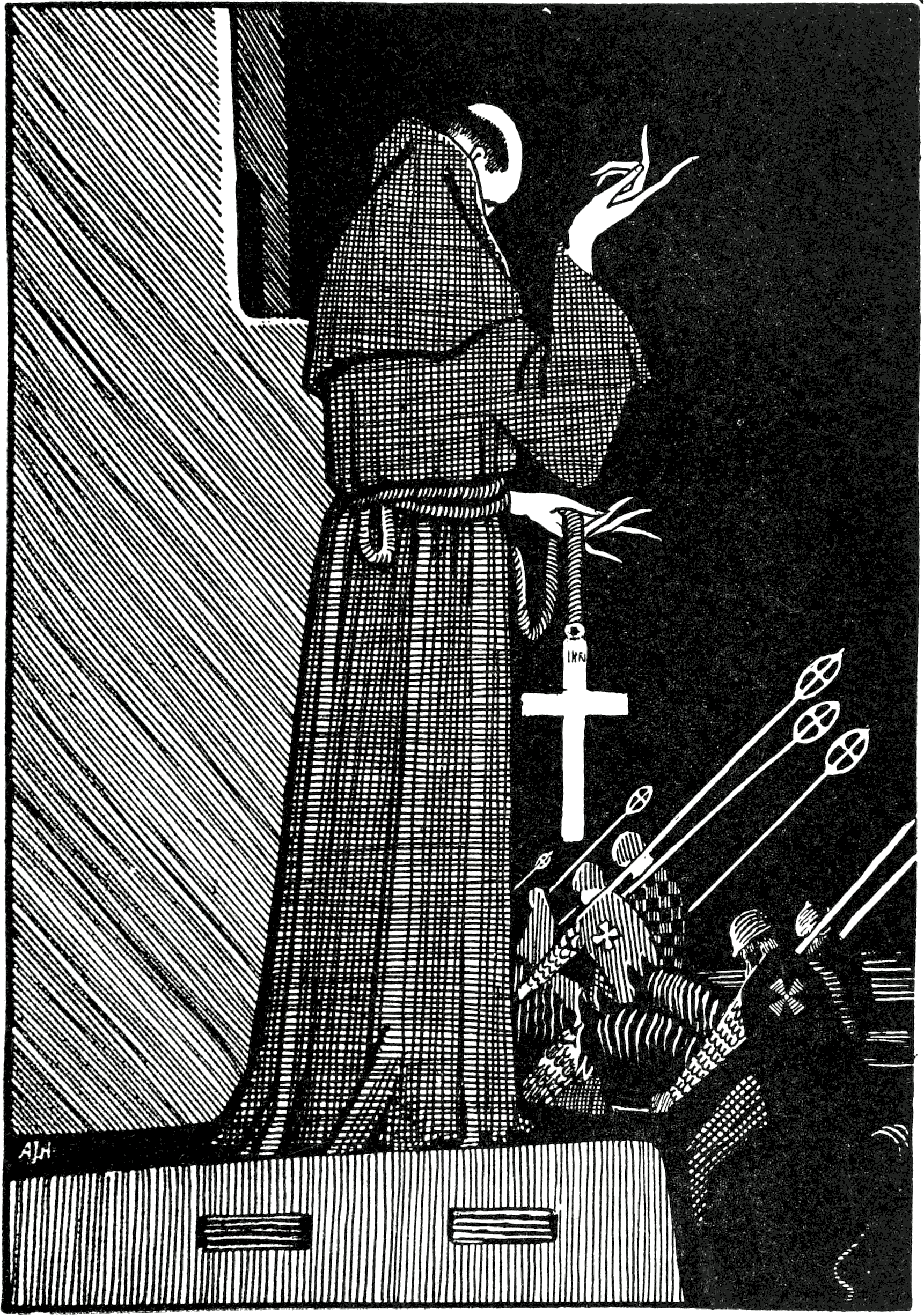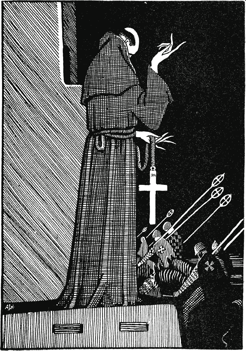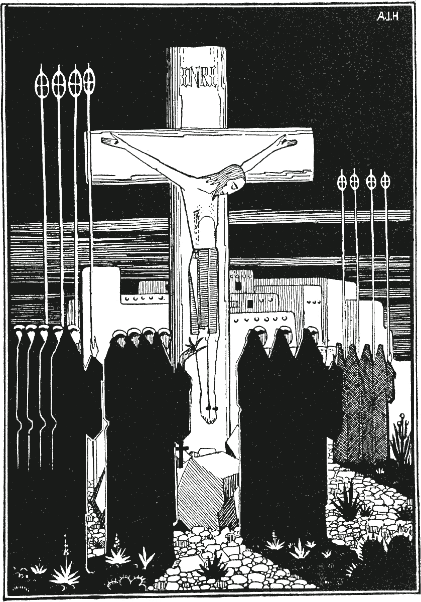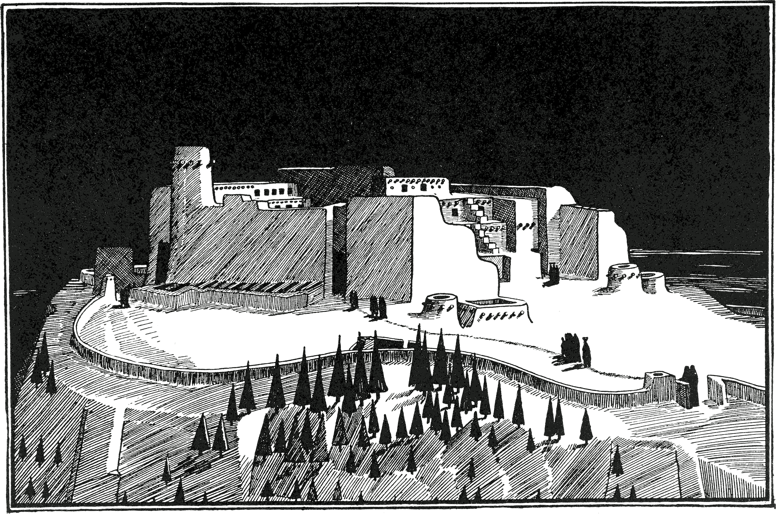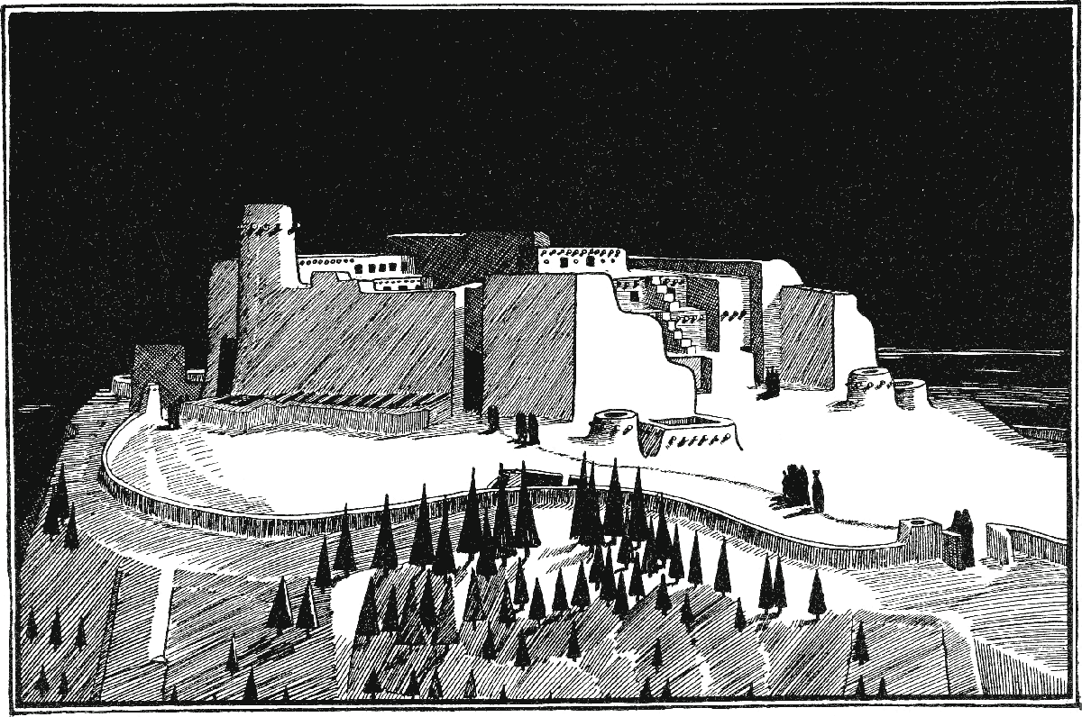 In 1838 the dozen or so of Indians, who comprised at that time the fading population of Pecos, abandoned their ancient pueblo and took refuge with their kinfolk of Jemez from the unceasing Comanche raids, which for more than a century had been diminishing the tribe. This closed a period of continuous occupation estimated by archaeologists at more than fifteen hundred years, during which the pueblo had become the most powerful in the Rio Grande region. A veritable fortress on its final site,—for it had been removed to the mesa top from an earlier location across the arroyo,—it is believed that Pecos had been founded as a result of the growing attacks of the wild tribes of the Plains and Desert upon the scattered farming communities of the fertile valleys and uplands of the vicinity. For many centuries and through many shifts of the local culture (by no means primitive when Pecos was founded) the community grew in strength—an eastern outpost of the Pueblo civilization. When in 1540 Coronado entered New Mexico in quest of the “seven cities of Cibola,” the people of Cicuyé (a Tewa name by which Pecos became known to the Spaniards) sent a delegation with presents, offering their friendship. Hernando de Alvarado was despatched to the town, where, says the chronicler Castañeda, “the people came out with(174) signs of joy, and brought them into the town with drums and pipes and something like flutes, of which they had a great many; they made many presents of cloth and turquoises, of which there are quantities in that region; and the Spaniards enjoyed themselves for several days.” Of the village Castañeda says: “The houses are all alike, four stories high. One can go over the top of the whole village without there being a street to hinder. There are corridors going all around it at the first two stories, by which one can go around the whole village.... The people of this village boast that no one has been able to conquer them and that they can conquer whatever villages they wish.” It was at Pecos that the Spaniards found the Plains Indian “El Turco,” who told of the wonderful Quivera and lured them on into the expedition toward the Missouri River. When finally Coronado returned to Mexico, Friar Luis, a lay brother, remained at Pecos, one of the two first missionaries of the region. Castañeda writes: “Nothing more has been heard about him; but before the army left Tiguex some men who went to take him a number of sheep met him as he was on his way to visit some other villages.... He felt very hopeful that he was liked at the village [Pecos] and that his teaching would bear fruit, although he complained that the old men were falling away from him. I, for my part, believe that they finally killed him.” Later the Franciscans built at Pecos one of their largest establishments, now a massive ruin.