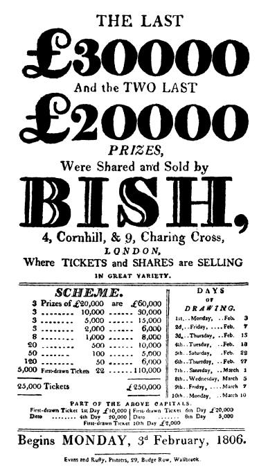 [20] Bish’s price in December, 1800, for a ticket in this lottery was £16 18s., and he says, “Tickets and Shares will rise gradually, as the Drawing approaches.”