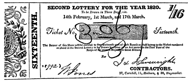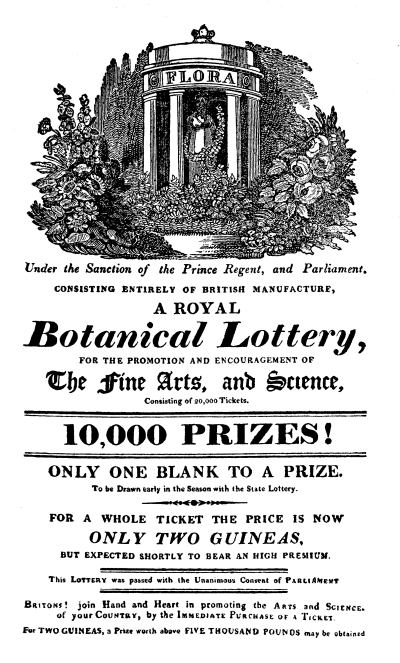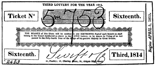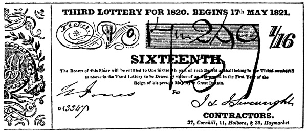 [19] The earliest lottery ticket I have seen, is in the collection of Miss Sophia Banks, sister of the famous Sir Joseph (Brit. Mus. 1890, e). It represents an eighth share in the lottery of 1775.