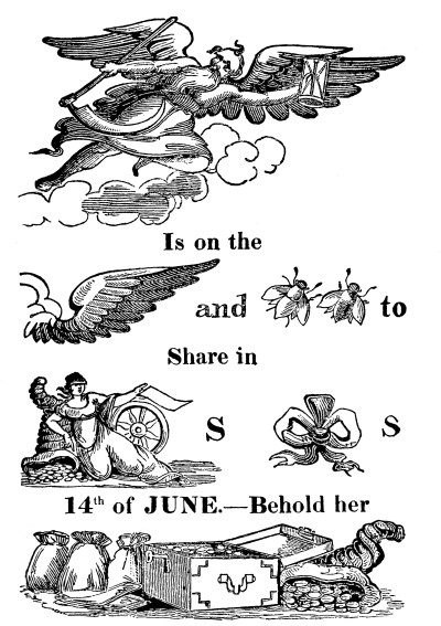 “Mansion House. A lady named Free, who had come up from the country to try her fortune in the lottery, came to complain to the Lord Mayor that she had been deprived of her property, the sixteenth [Pg 328] share of a £30,000 prize, by the misconduct of those engaged in conducting the drawing. She stated that she chose the ticket No. 17,092.
