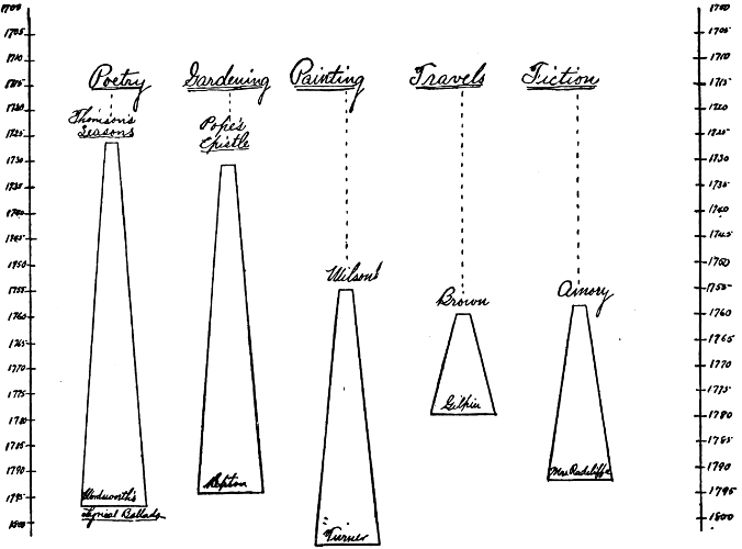[649] Biese in “Die Entwickelung des Naturgefühls,” pp. 209–48, gives a brief résumé of the development of landscape painting in Germany. He calls Rubens and his school the first to make the painting of Nature an independent branch of art, while Ruysdael (1681) is the one in whom “die ganze Poesie der Natur” finds expression. His chapter closes with these words: “Alle diese grossen Niederländer eilen weit der Poesie ihrer Zeit voraus; Gebirge und Meer finden im Wort erst 100 Jahre später ihrer begeisterten Schilderer, und ein in sich stimmungsvoll, abgeschlossenes, lyrisches Landschaftsbild wird erst am Ende des achtzehnten Jahrhunderts in der deutschen Dichtung geboren.” In England, it will be observed, the love of Nature finds earlier and more abundant expression in poetry than in painting, and its completest expression in Wordsworth’s poetry precedes its complete expression in the great English landscape painters of the early nineteenth century. See also for brief résumé of “Landschaftsmalerei” as an indication mainly of the increasing knowledge of distant lands, new forms of vegetation, etc., Humboldt, “Kosmos,” II, 47–58.