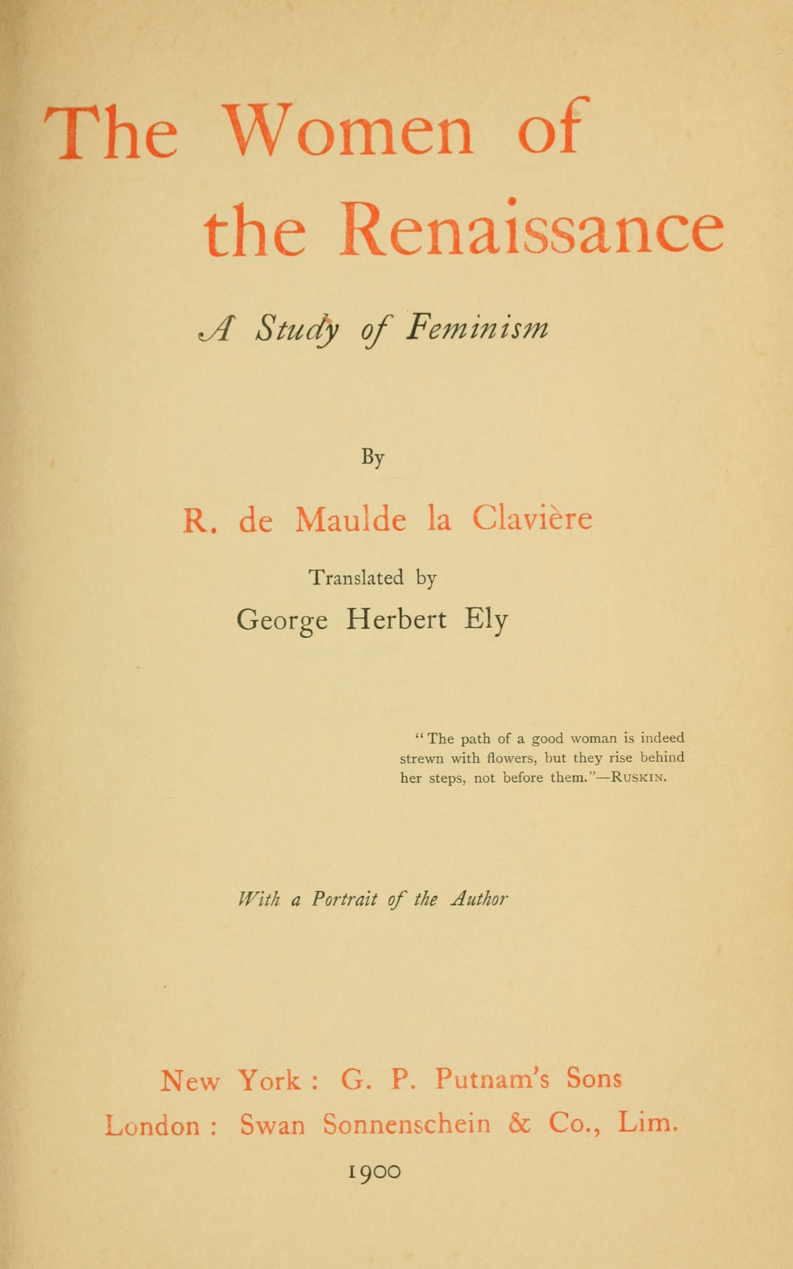 “M. de Maulde writes in great detail and with commendable erudition on the position of women and the feminist movement of the sixteenth century as it shaped itself in Italy and, later, in France. These studies of the woman of those days, in all her social relations and in all her activities, are illustrated with an unceasing flow of anecdote and citation, never more apt than when employed to characterise that remarkable group who were imbued with the so-called ‘idées platoniciennes.’... After a really interesting sketch of the composition of that curious amalgam which finds its complete expression in the harangue of Bembo ... M. de Maulde draws many inferences which have a direct application to the feminist movement of our own day; in contrast, for instance, with the mystical ardours of Renaissance platonism we hear of the naturalism of John Ruskin. For this reason the book will, we think, attract a wide circle of readers; many ... will be delighted by its store of lively and significant anecdote.”
