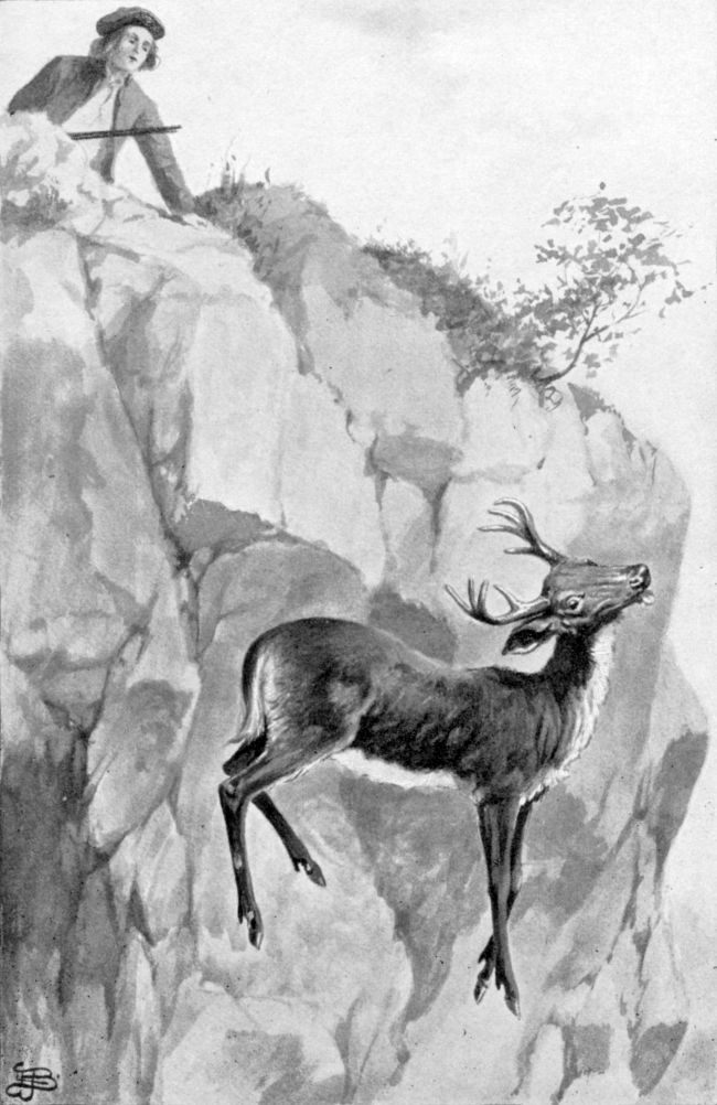 In its fatal alarm the terrified animal had not seen him. In fact it seemed to see nothing in its pathway,—not even the precipice cutting off further retreat. As if preferring death by a mad leap over the chasm, it sped to the very brink without checking the speed of its flying feet! Norman held his breath with a feeling of horror at the inevitable fate of the poor creature. The hound, as if realising the desperate strait to which it had driven its prey, stopped. Then, with a last mournful glance backward, and a sharp cry of pain and despair, the deer sprang out over the dizzy brink, its beautiful form sinking swiftly upon the stony earth at the foot of Rock Rimmon!
