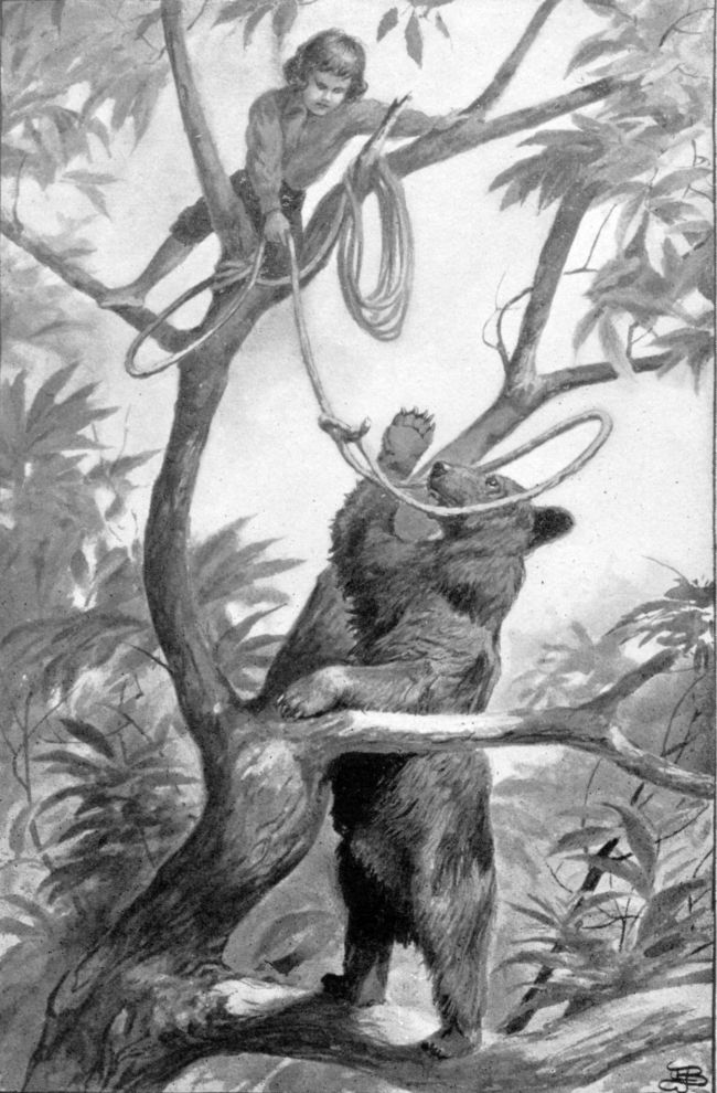 “Climb down hyur, youngster, and see thet ye air spry erbout it, for I don’t think o’ spending the night in these woods.”