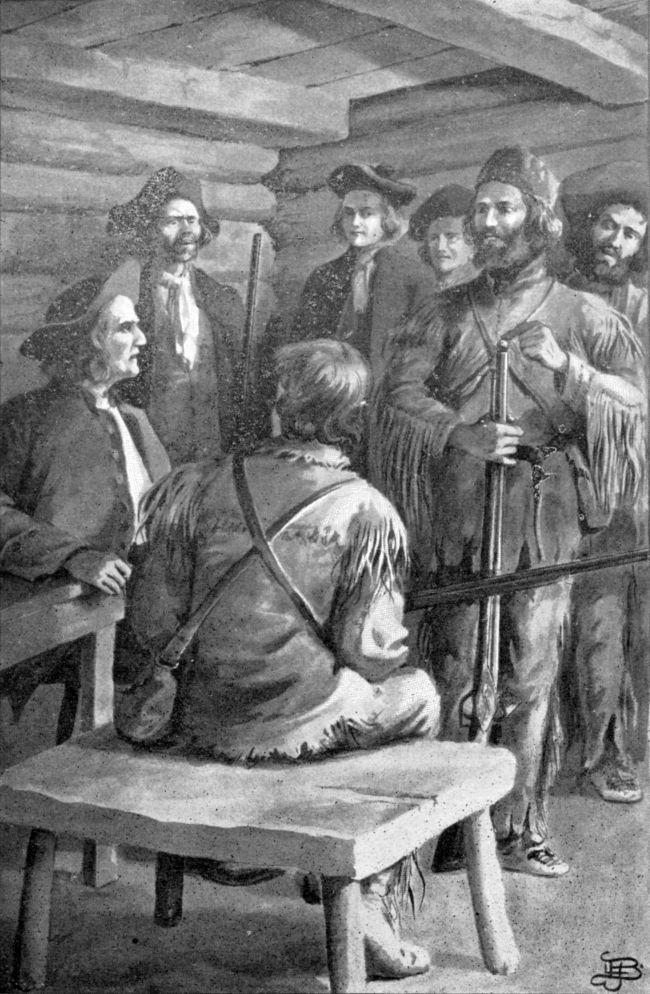 His companion, whom Norman remembered as having seen once or twice the previous season, was several years the senior of the other, and of altogether different appearance. He was clad in a well-worn suit of buckskin, the frills on the leggins badly frayed from long contact with the briars and brushwood of the forest. His feet were encased in a pair of Indian moccasins, while he wore on his head a cap of fox skin, with the tail of the animal hanging down to the back of his neck. Though bronzed by long exposure to the summer sun and winter wind, scarred by wounds, and rendered shaggy by its untrimmed beard, his face bore that stamp of frank, honest simplicity which was sure to win for the man the respect and confidence of those he met. The silver streaks in the hair falling in profusion [18]about his neck told that he was passing the prime of life. Still there was great strength in the long, muscular limbs, and, while he moved generally with a slow, shuffling gait, he was capable of astonishing swiftness of movement whenever it was called for.